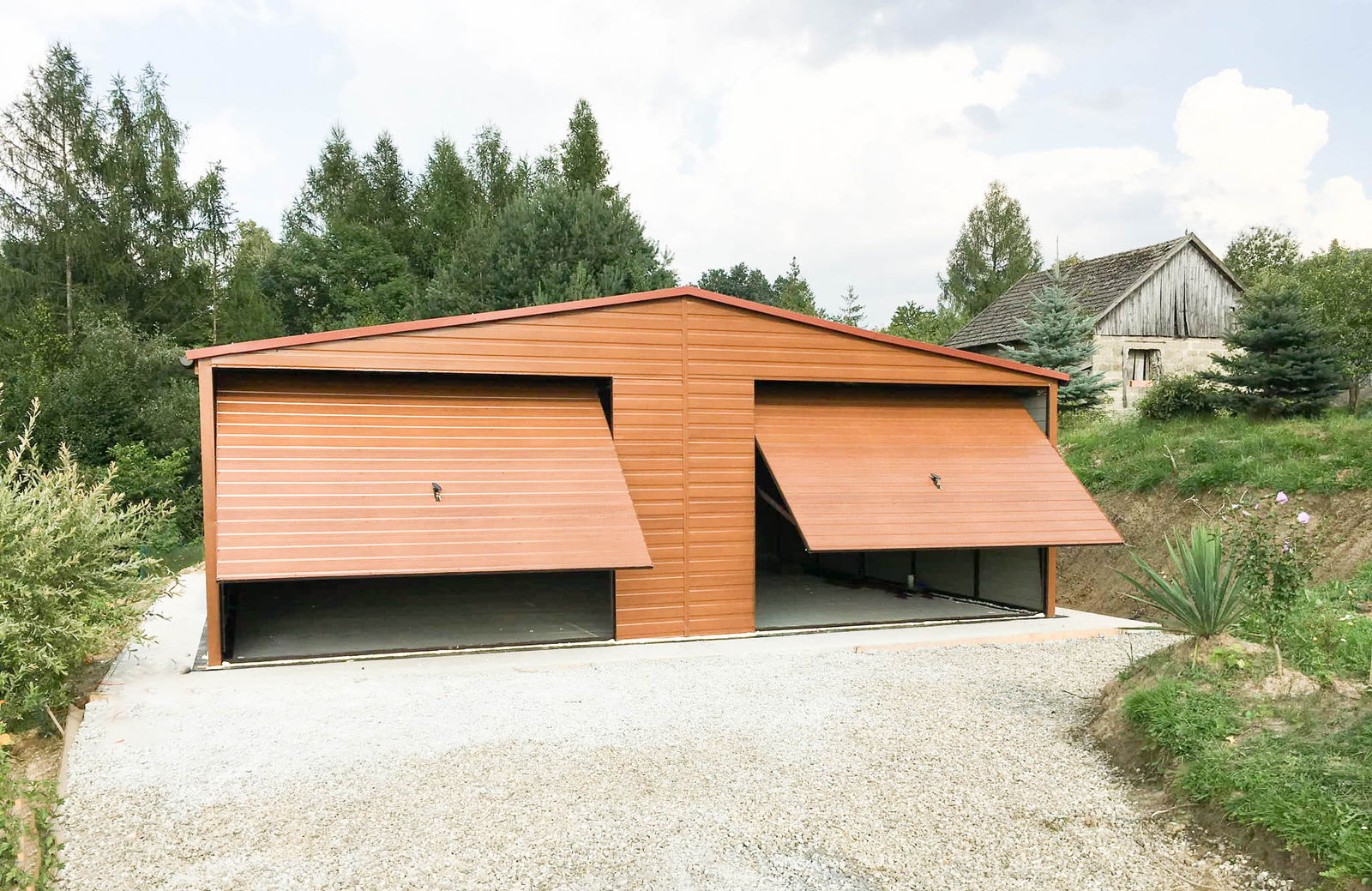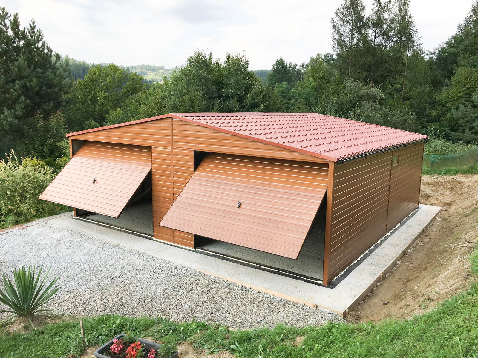 Garaż blaszany 7,5x6m 2x brama uchylna okno blachodachówka rynny ID795