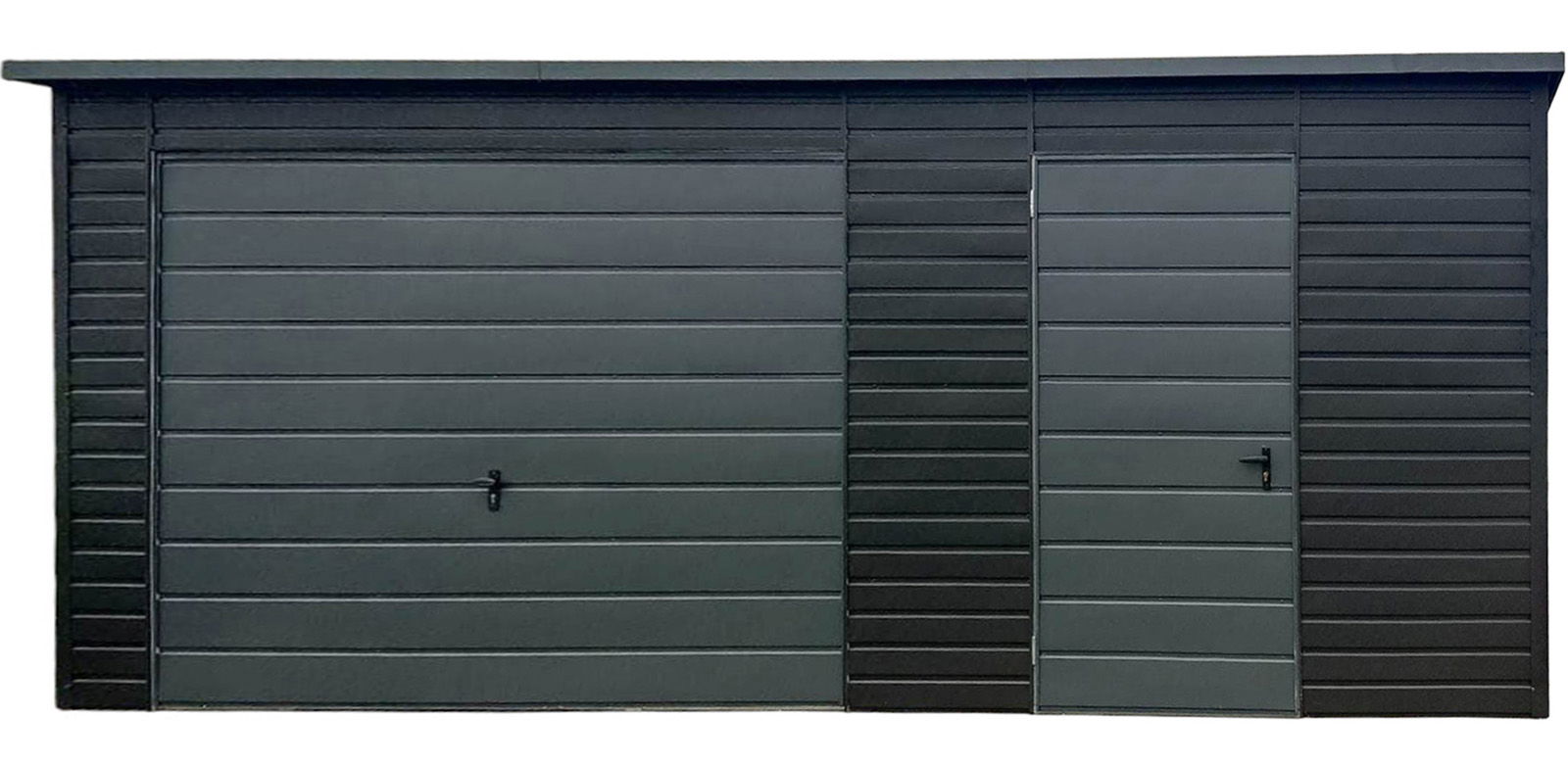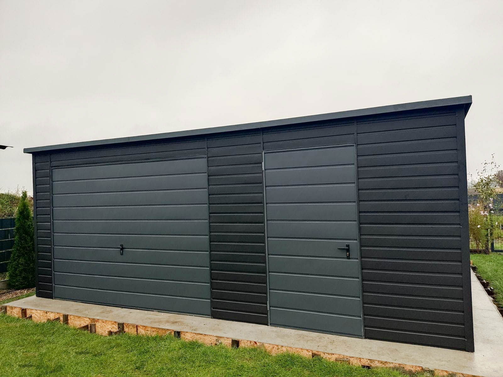 • szerokość: 7 m • długość: 5 m • dach: spad w tył kolor Czarny BTX 9005 • Brama uchylna 300x200 cm przetłoczenie poziom T17 kolor Ciemny Grafit Antracyt RAL 7016 • drzwi 100x200 cm przetłoczenia T17 kolor Ciemny Grafit Antracyt RAL 7016 • okno uchylne Pcv 80x60cm • Przetłoczenie ścian T7 poziom Czarny BTX 9005 • wysokość ściany przedniej: 233 cm • wysokość ściany tylnej: 210 cm • Wysokość światła wjazdu 190 cm • Konstrukcja - profil zamknięty ocynk • Zamek + Klucze • nity + wkręty w kolorze garażu • obróbki ścian i dachu Czarny BTX 9005