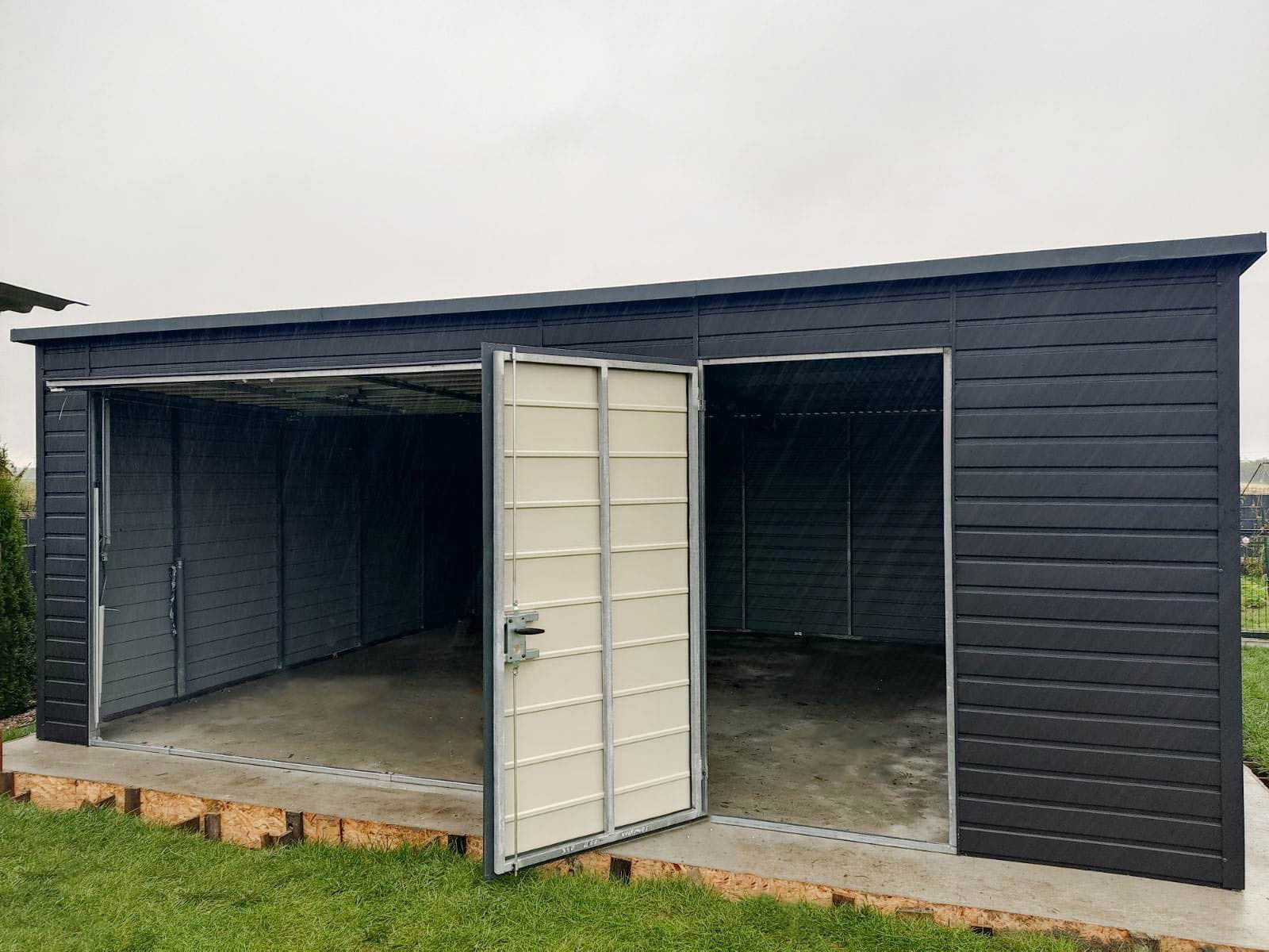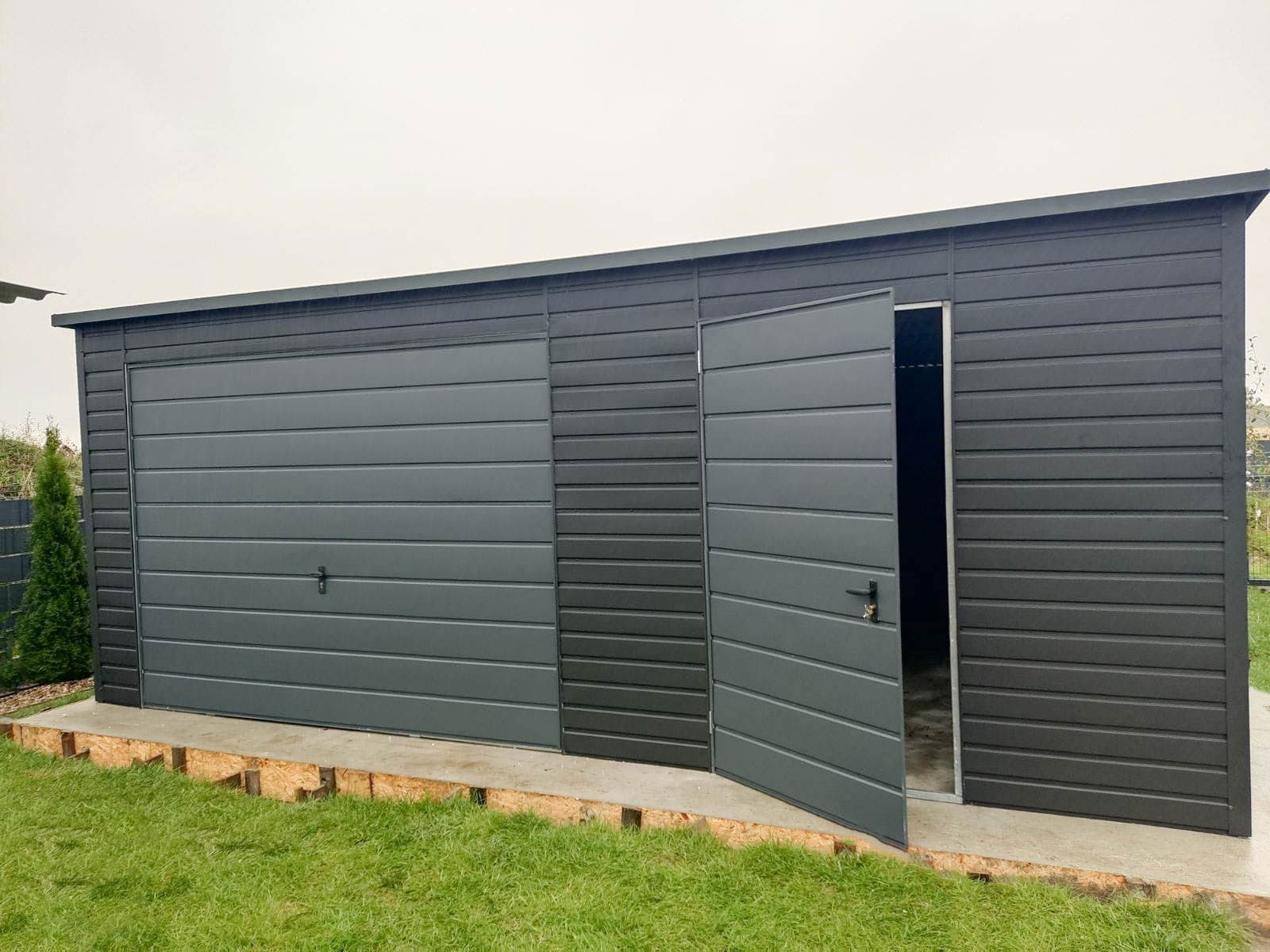 Garaż blaszany 7x6m brama uchylna drzwi okno dach spad w tył ID790
