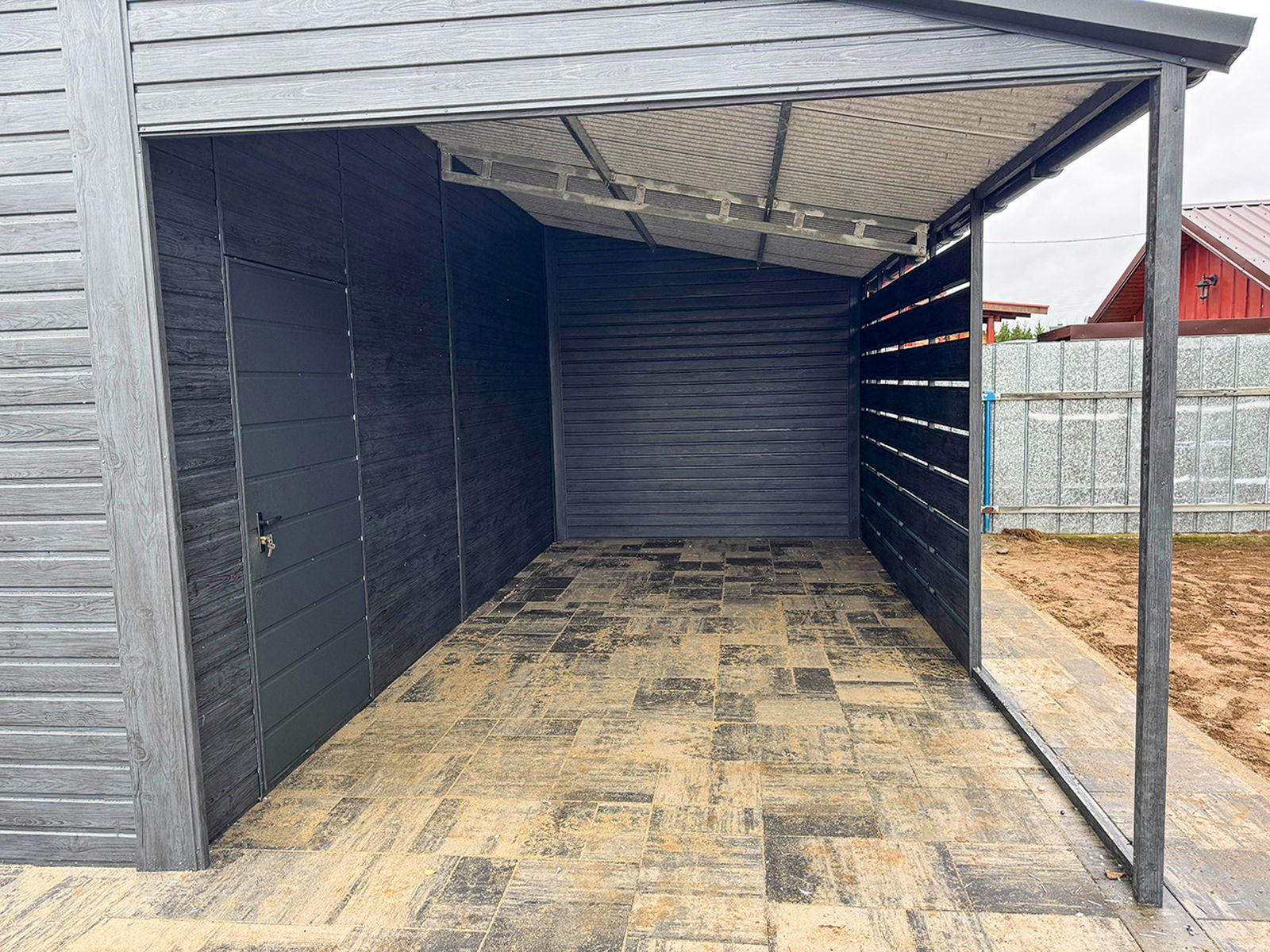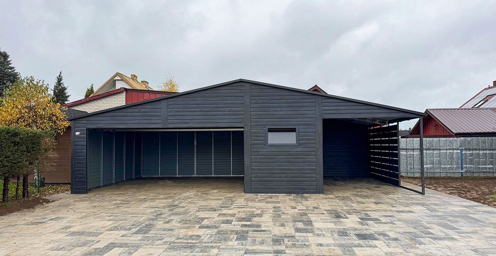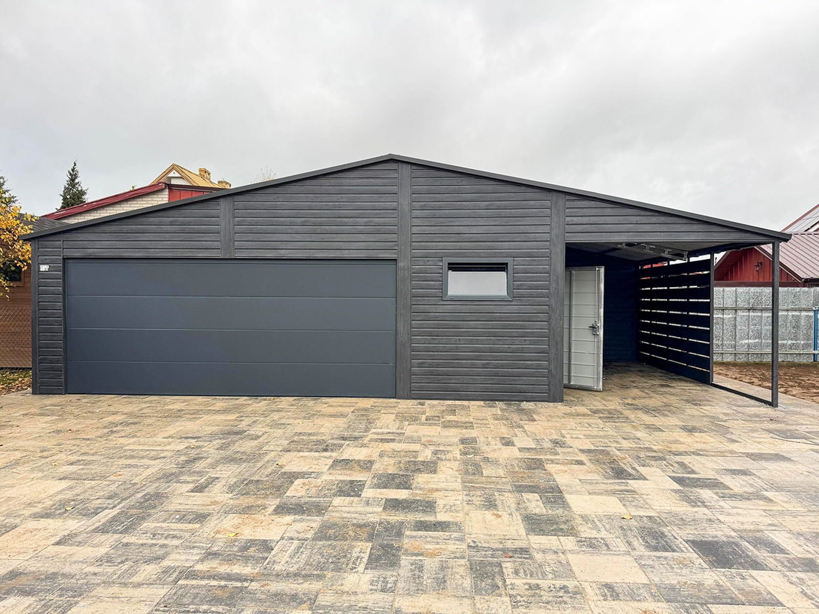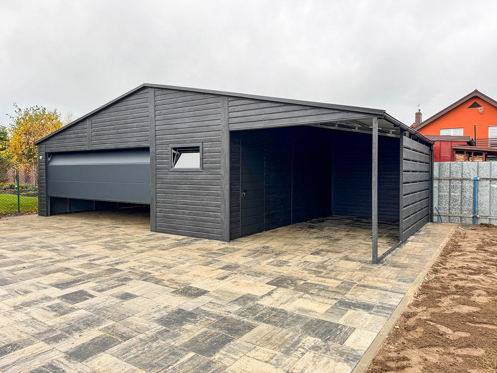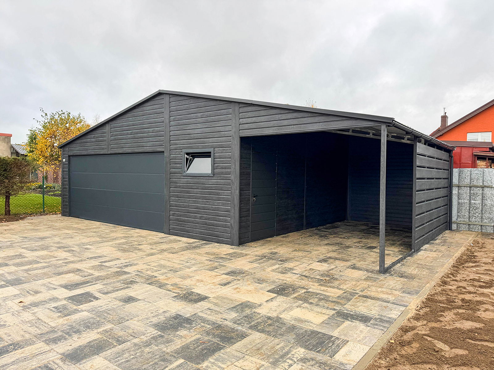 - szerokość: 8 m- długość: 6 m- wiata 3x6 m umiejscowiona z prawej strony garażu z tyłu zabudowana blachąprzetłoczenia T7 poziome kolor sosna norweska zboku na długości 400 cm zabudowana panelami kolor sosna norweska ( kolor odwewnętrznej i zewnętrznej strony wiaty)- obróbki wiaty kolor sosna norweska- rozmiar całkowity: 11x6 m- dach: dwuspadowy kolor antracyt mat BTX 7016- ściany przetłoczenie poziome T7 kolor sosna norweska- brama segmentowa 510x200 cm ,kolor antracyt mat BTX 7016, umiejscowiona naprzedniej ścianie 50 cm od lewej krawędzi- wysokość światła wjazdu 200 cm- drzwi 100x200 cm przetłoczenie poziome T17 kolor antracyt mat BTX 7016,umiejscowione na prawej ścianie 50 cm od przedniej krawędzi, drzwi otwierane na prawo- okno uchylne 100x60 cm PCV kolor antracyt umiejscowione na przedniej ścianie 70 cmod prawej krawędzi, 150 cm od podłoża- wysokość ścian : 243 cm- konstrukcja profil zamknięty ocynkowany - nity + wkręty w kolorze garażu- klamka+ klucze- obróbki ścian kolor sosna norweska- obróbki dachu kolor antracyt mat BTX 7016- rynny+ spusty