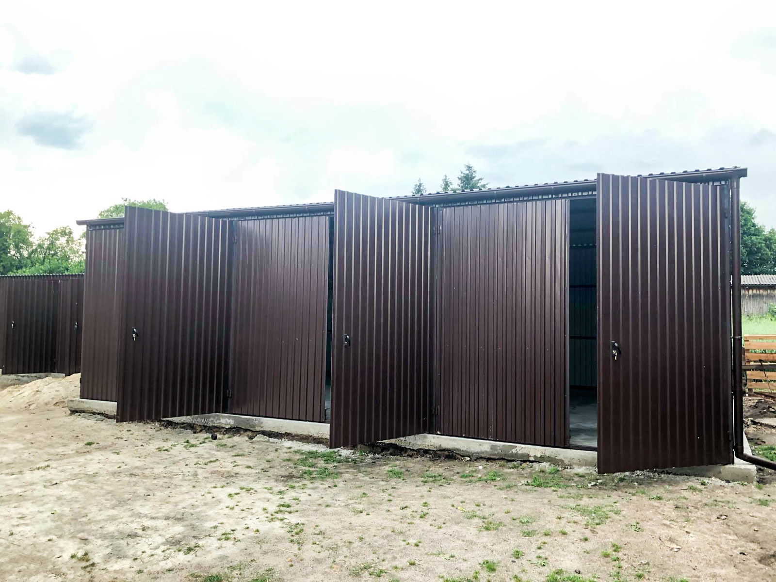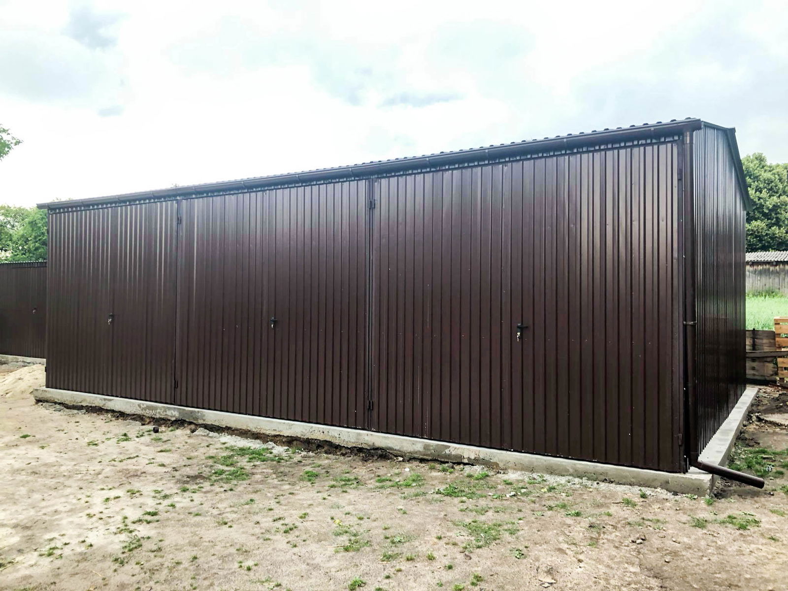 Garaż blaszany 9x5 - 3x Brama dwuskrzydłowa - Rynny - Brązowy - Dach GB186