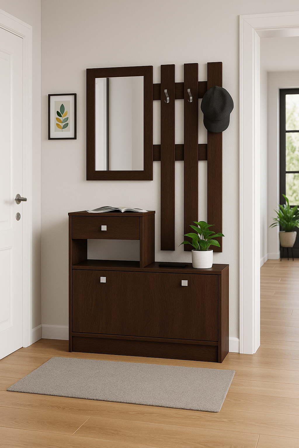Garderoba, szafka na buty, wieszak, lustro, BELLANO, 90 cm. Zestaw mebli do przedpokoju sprawi, że w mieszkaniu znów zapanuje ład i porządek. Koniec z porozrzucanym obuwiem i niechlujnie odłożonymi ubraniami. W pojemnej szafce zmieści się kilka par butów, a na wieszakach mogą zawisnąć kurtki i płaszcze wszystkich członków rodziny. Komplet został również wyposażony w duże lustro. Teraz przed każdym wyjściem z domu można się upewnić, czy ma się dobrze ułożoną fryzurę. Meble do przedpokoju z wieszakiem i szafką na buty są niezwykle funkcjonalnym i praktycznym rozwiązaniem. Zamiast samodzielnie kompletować zestaw, można postawić na sprawdzoną opcję, której zaufało już wielu konsumentów.