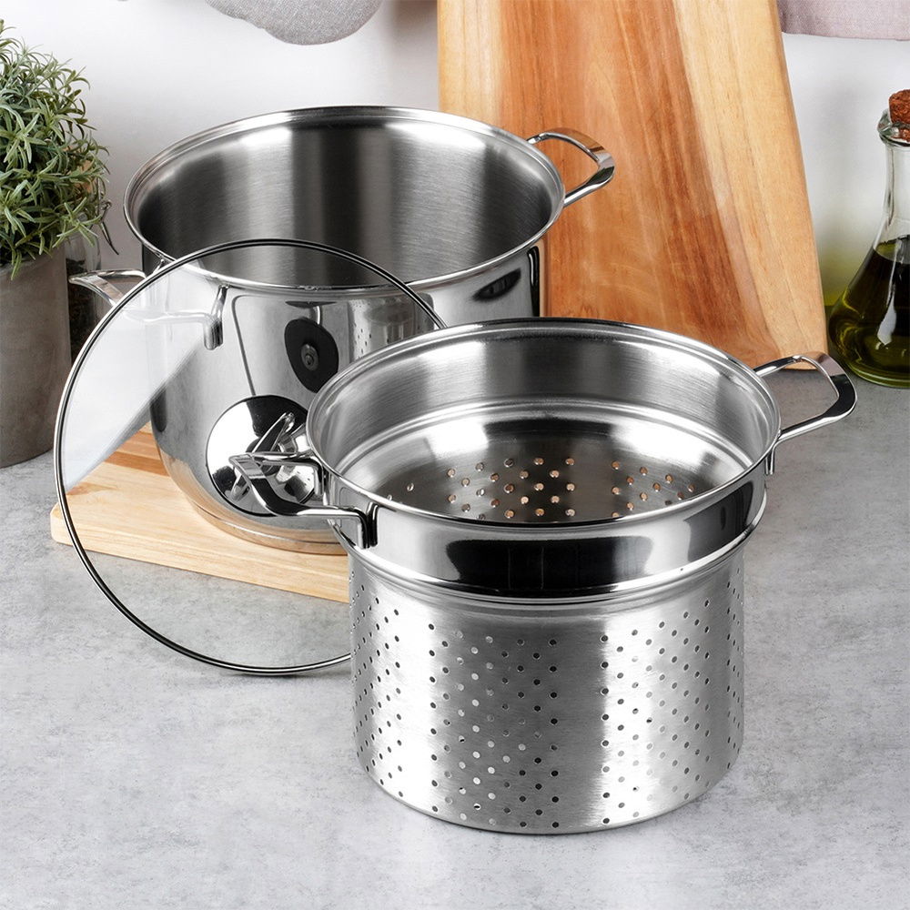 Garnek do makaronu wyposażony w pokrywkę z odpowietrznikiem pary oraz sitko do gotowania. Garnek możemy wykorzystać osobno lub z wkładem. Niezwykle praktyczny, przydatny w każdej kuchni również profesjonalnej. Idealny do gotowania różnego rodzaju makaronu, ziemniaków i warzyw. Zastosowanie sitka podczas gotowania makaronu, pozwoli na jego perfekcyjne ugotowanie i odcedzenie bez konieczności użycia dodatkowego cedzaka kuchennego.
