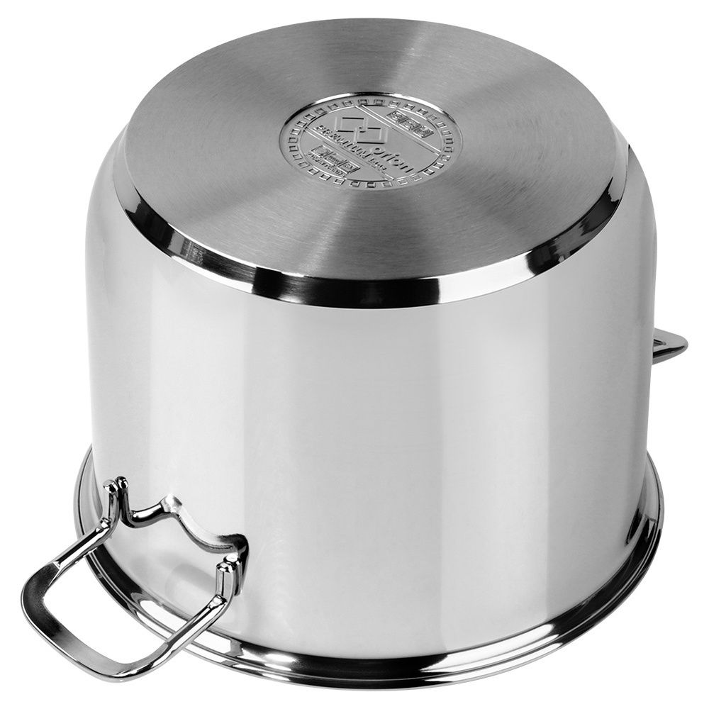 SOLIDNY - Wykonany z najwyższej jakości stali nierdzewnej polerowanej na wysoki połysk. Garnek jest solidny i wytrzymały. Wyposażony w pokrywkę wykonaną ze szkła i stali nierdzewnej.