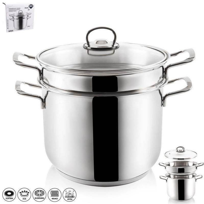 NIEZAWODNY - Uniwersalny garnek do gotowania z serii ANETT o średnicy 22 cm i pojemności 5 litrów. W zestawie pokrywa z odpowietrznikiem oraz specjalny wkład do gotowania na parze. Garnek oraz wkład na parę wykonane z najwyższej jakości stali nierdzewnej 304 - 18/10. Ich zewnętrzna strona została polerowana na wysoki połysk. Zestaw wyposażony w pokrywkę wykonaną ze szkła i stali nierdzewnej. Wymiary zewnętrzne garnka: 31,5 x 22 x 22 cm, a wysokość z wkładem i pokrywką wynosi 26 cm. Wkład na parę ma głębokość 9 cm.