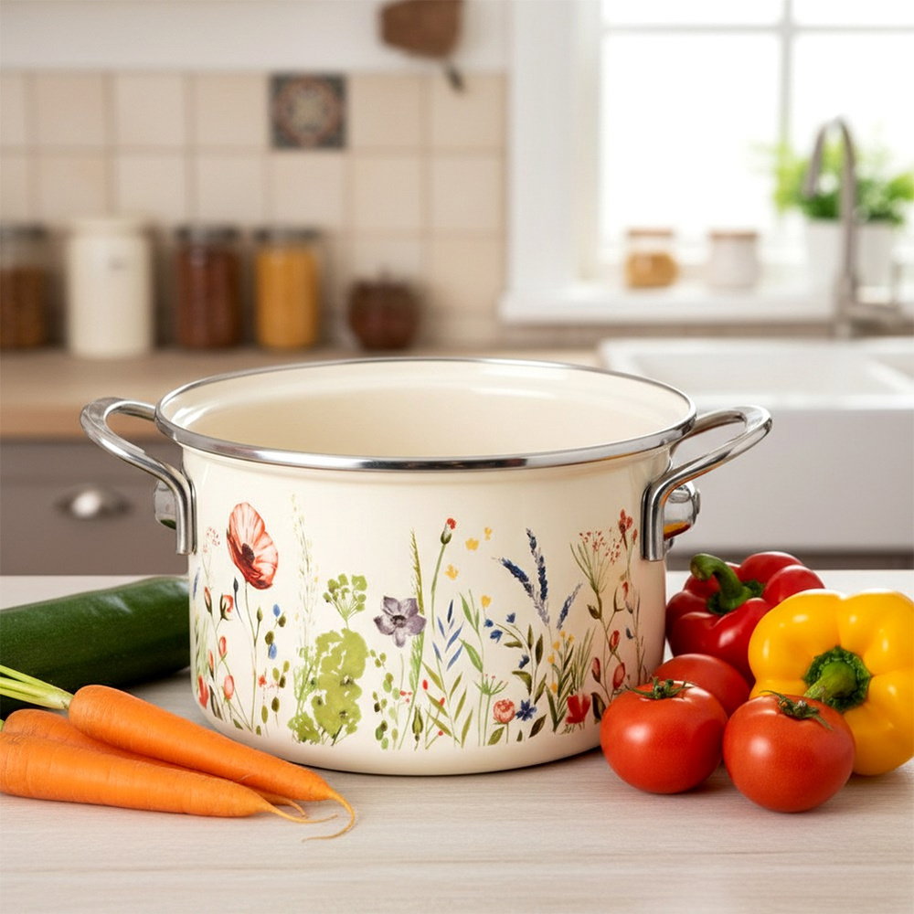 Wykonany ze stali emaliowanej - Wykonany z najwyższej jakości stali emaliowanej w kremowym kolorze z dekoracyjnym motywem polnych kwiatów. Rant garnka oraz uchwyty wykonane ze stali nierdzewnej. Emalia, którą pokryto naczynie jest materiałem przyjaznym dla zdrowia, a nawet bezpiecznym dla alergików.