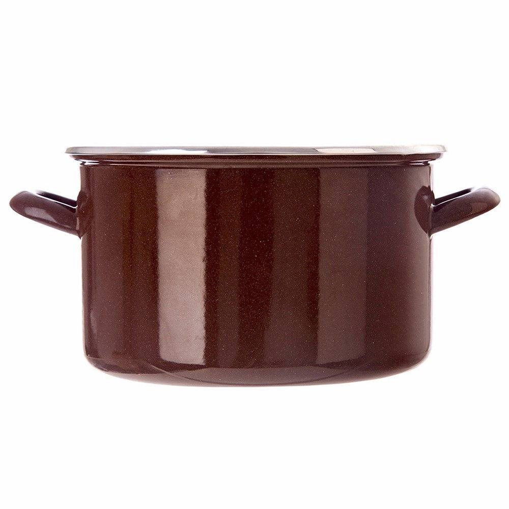 Wykonany ze stali emaliowanej - Wykonany z najwyższej jakości stali emaliowanej. Zewnętrzna część oraz uchwyty są w kolorze brązowym, a wnętrze garnka w kolorze beżowym. Rant garnka został wykonany ze stali nierdzewnej w srebrnym kolorze. Emalia, którą pokryto naczynie jest materiałem przyjaznym dla zdrowia, a nawet bezpiecznym dla alergików.