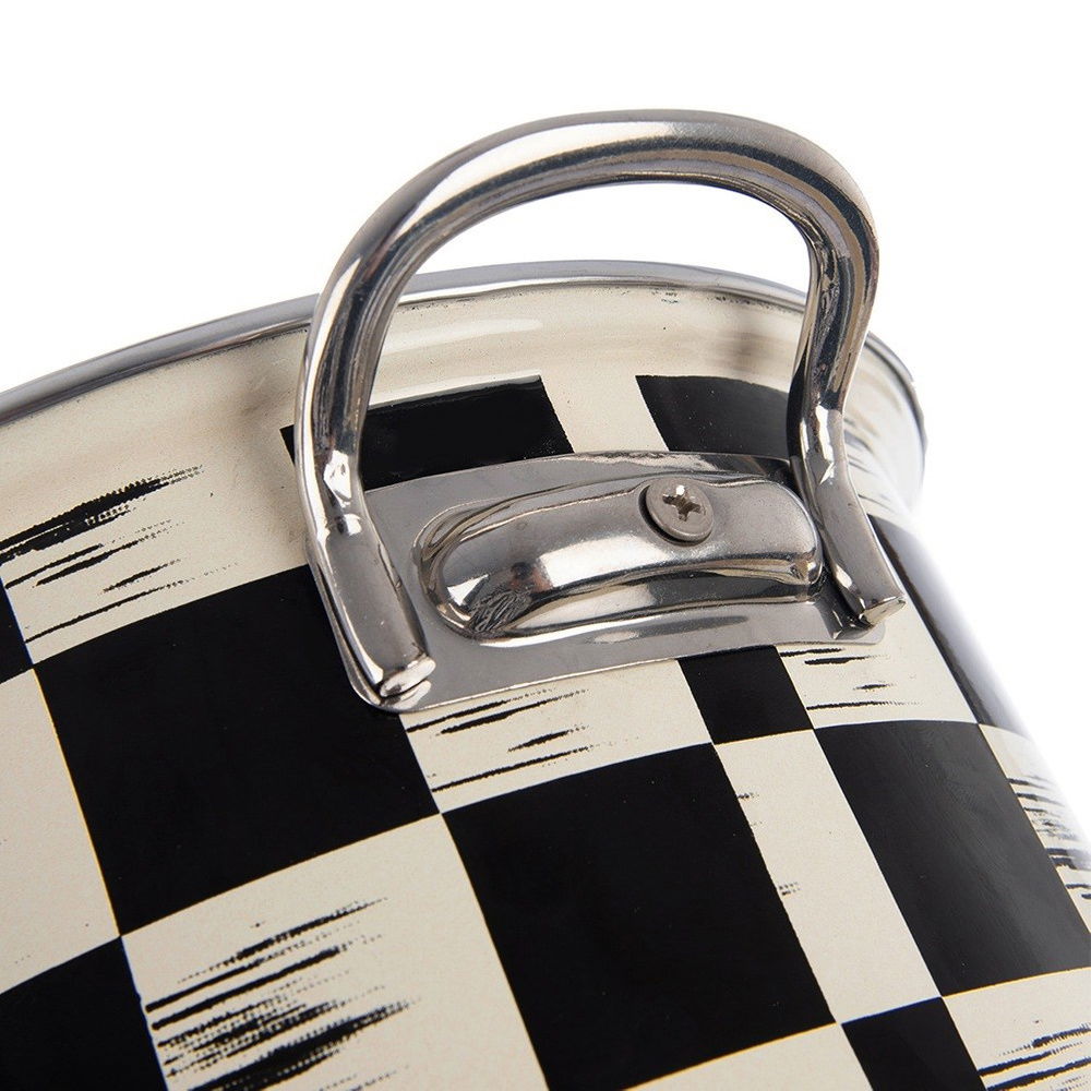 Wykonany ze stali emaliowanej - Wykonany z najwyższej jakości stali emaliowanej. Zewnętrzna część garnka z efektownym wzorem w czarno - beżową kratę. Wnętrze garnka jest w kolorze beżowym. Rant garnka został wykonany ze stali nierdzewnej w srebrnym kolorze, a uchwyty z metalu w srebrnym kolorze. Emalia, którą pokryto naczynie jest materiałem przyjaznym dla zdrowia, a nawet bezpiecznym dla alergików.