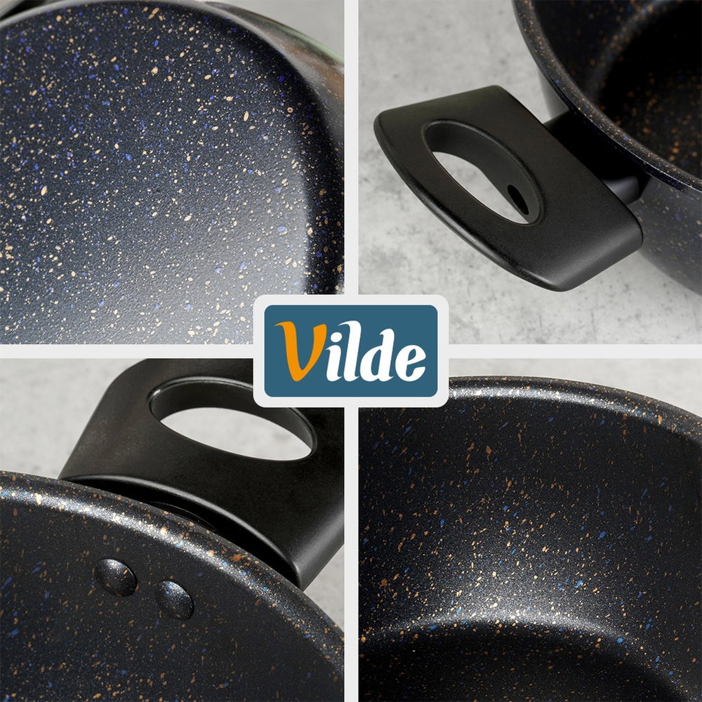 NIEPRZYWIERAJĄCA POWŁOKA GRANITOWA - Wykonany ze stali węglowej z nieprzywierającą powłoką granitową. Powierzchnia nieprzywierająca umożliwia przygotowywanie zdrowych i smacznych posiłków z minimalną ilością tłuszczu. Uchwyty wykonane z tworzywa w czarnym kolorze.