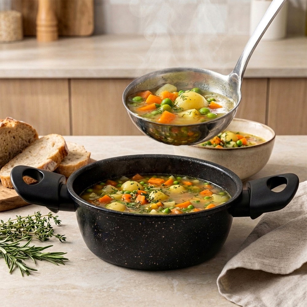 Klasyczny garnek wykonany z solidnych materiałów, jest niezwykle poręczny i wygodny w codziennym użytkowaniu. Garnek sprawdzi się do gotowania oraz duszenia – przygotujemy w nim różnego rodzaju dania, zupy czy sosy. Dzięki nieprzywierającej powłoce granitowej gotowanie jest wygodne, a czyszczenie naczynia szybkie i bezproblemowe.