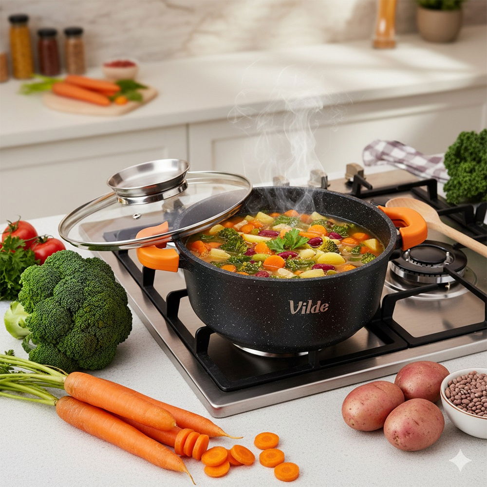 Uniwersalny garnek z pokrywką z dozownikiem oraz silikonowymi uchwytami, idealny do gotowania, pieczenia, duszenia i smażenia potraw. Przygotowane w nim dania są soczyste i aromatyczne. Garnek jest trwały, funkcjonalny i idealny do bezpośredniego serwowania dań na stole.