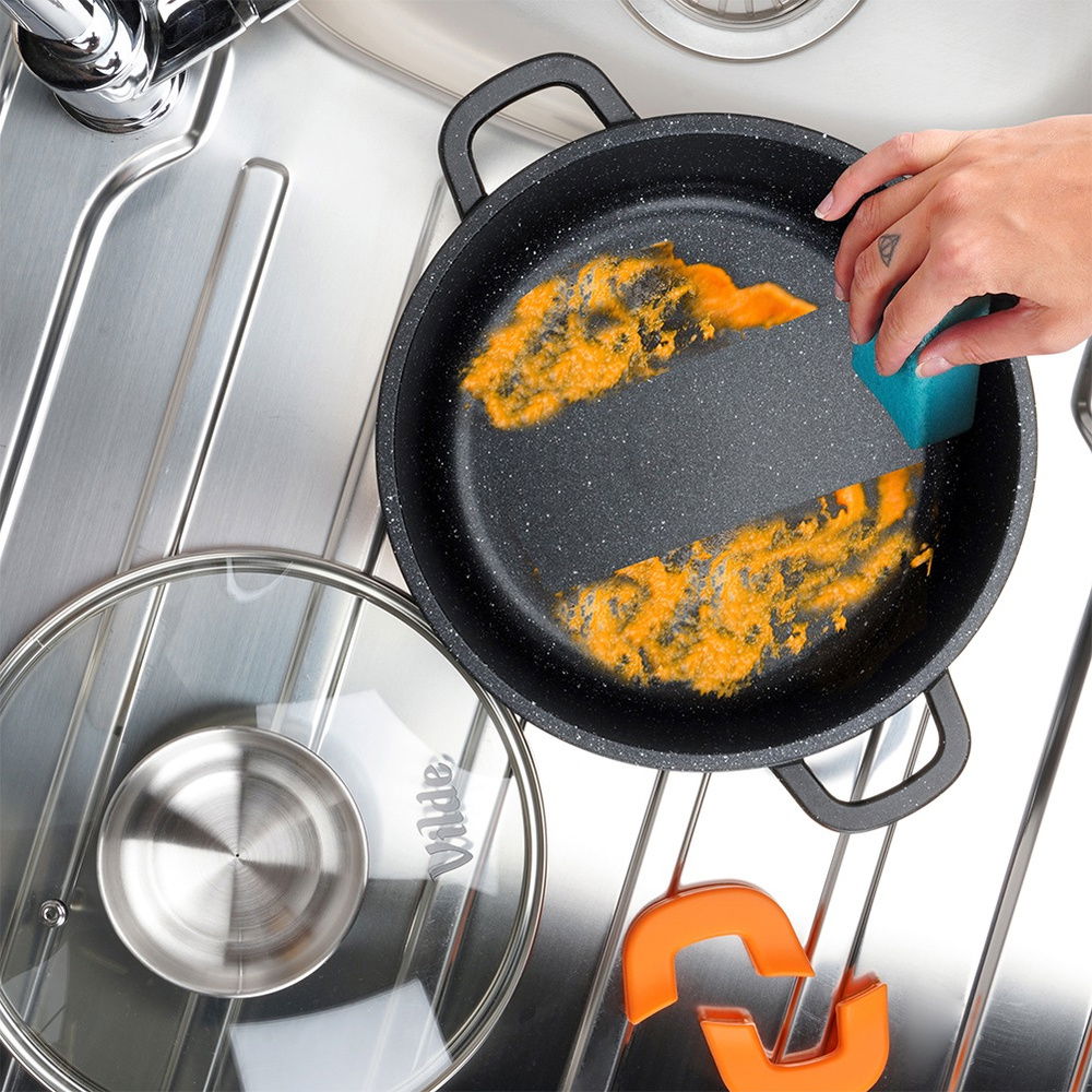 Granitowa powłoka i żaroodporna pokrywka - Garnek wykonany jest z odlewu aluminium z nieprzywierającą powłoką granitową, co umożliwi przygotowanie potraw na minimalnej ilości tłuszczu. Pokrywka jest żaroodporna, uchwyt w pokrywce wykonany jest ze stali nierdzewnej. W zestawie praktyczne uchwyty do garnka wykonane z silikonu w pomarańczowym kolorze.