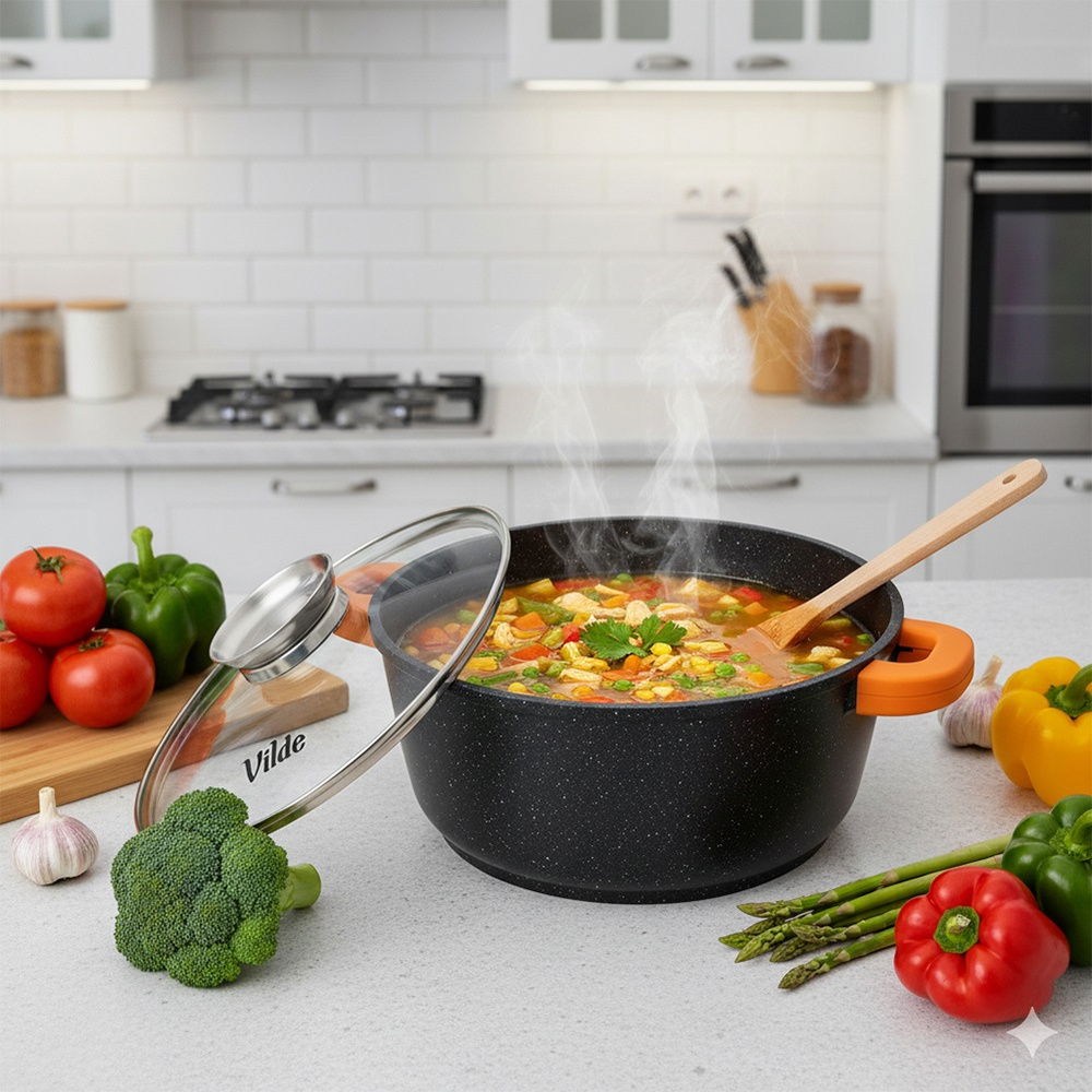 Uniwersalny garnek z pokrywką z dozownikiem oraz silikonowymi uchwytami, idealny do gotowania, pieczenia, duszenia i smażenia potraw. Przygotowane w nim dania są soczyste i aromatyczne. Garnek jest trwały, funkcjonalny i idealny do bezpośredniego serwowania dań na stole.