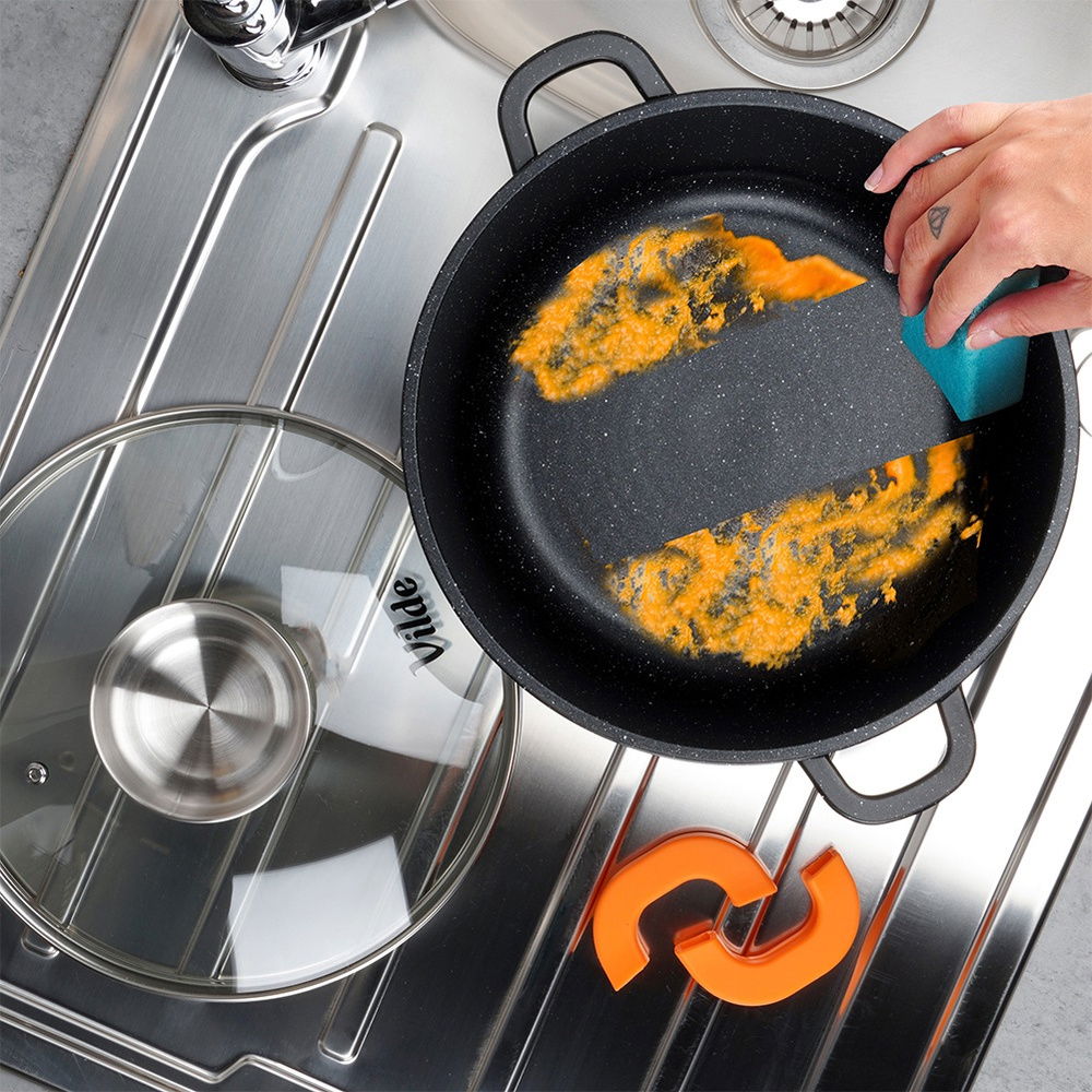 Granitowa powłoka i żaroodporna pokrywka - Garnek wykonany jest z odlewu aluminium z nieprzywierającą powłoką granitową, co umożliwi przygotowanie potraw na minimalnej ilości tłuszczu. Pokrywka jest żaroodporna, uchwyt w pokrywce wykonany jest ze stali nierdzewnej. W zestawie praktyczne uchwyty do garnka wykonane z silikonu w pomarańczowym kolorze.