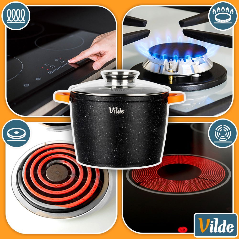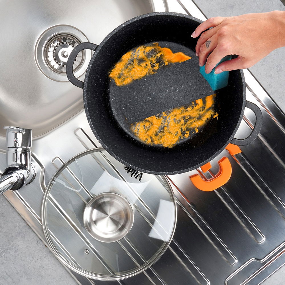Granitowa powłoka i żaroodporna pokrywka - Garnek wykonany jest z odlewu aluminium z nieprzywierającą powłoką granitową, co umożliwi przygotowanie potraw na minimalnej ilości tłuszczu. Pokrywka wykonana ze szkła, uchwyt w pokrywce wykonany jest ze stali nierdzewnej. W zestawie praktyczne uchwyty do garnka wykonane z silikonu w pomarańczowym kolorze.