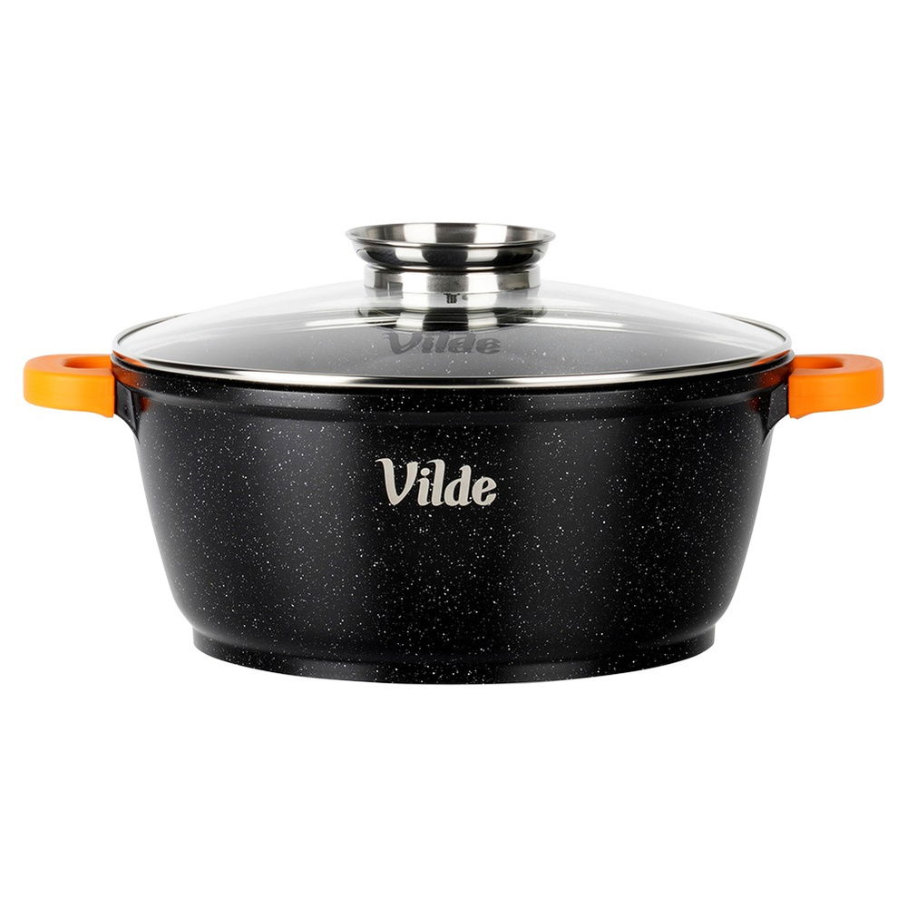 Granitowa powłoka i żaroodporna pokrywka - Garnek wykonany jest z odlewu aluminium z nieprzywierającą powłoką granitową, co umożliwi przygotowanie potraw na minimalnej ilości tłuszczu. Pokrywka jest żaroodporna, uchwyt w pokrywce wykonany jest ze stali nierdzewnej. W zestawie praktyczne uchwyty do garnka wykonane z silikonu w pomarańczowym kolorze.