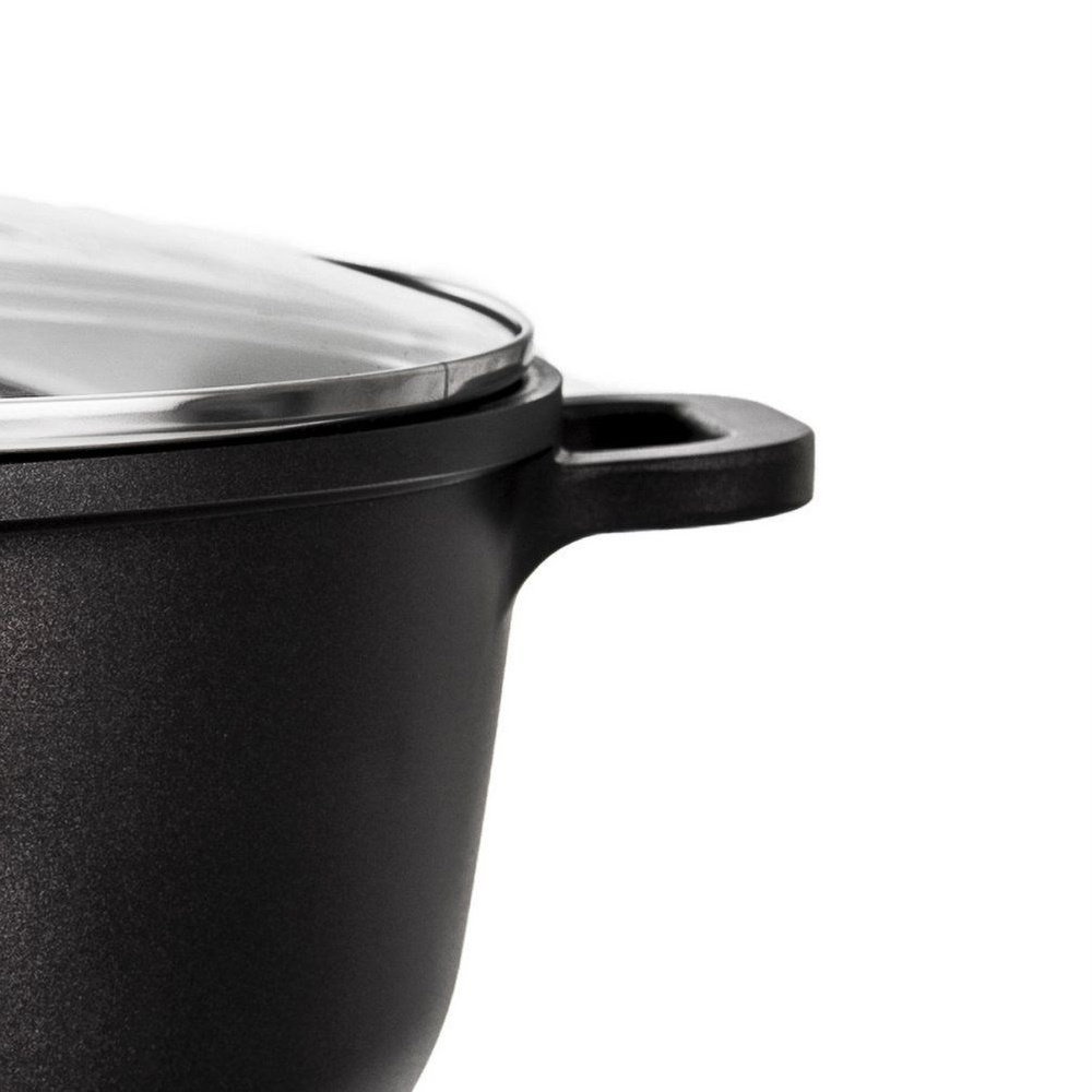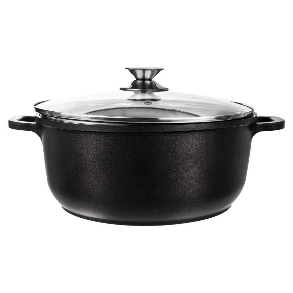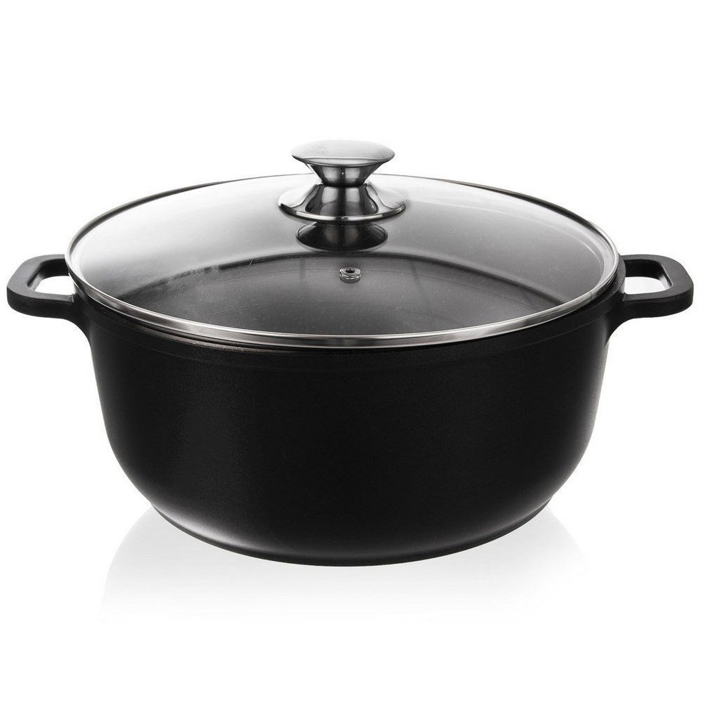 NIEZAWODNY - Garnek o średnicy 28 cm i pojemności 7 litrów z pokrywką. Garnek wykonany z aluminium w czarnym kolorze, wewnątrz posiada nieprzywierającą powłokę granitową. Wyposażony w pokrywkę wykonaną ze szkła i stali nierdzewnej. Wymiary zewnętrzne garnka: 36,5 x 29 x 12,5 cm, wysokość z pokrywką wynosi 18 cm.