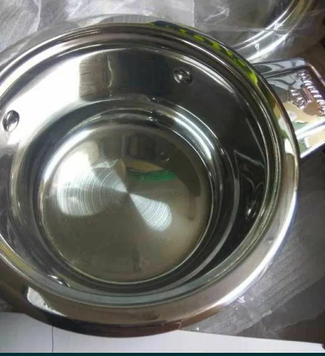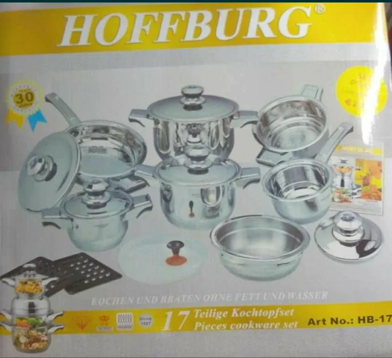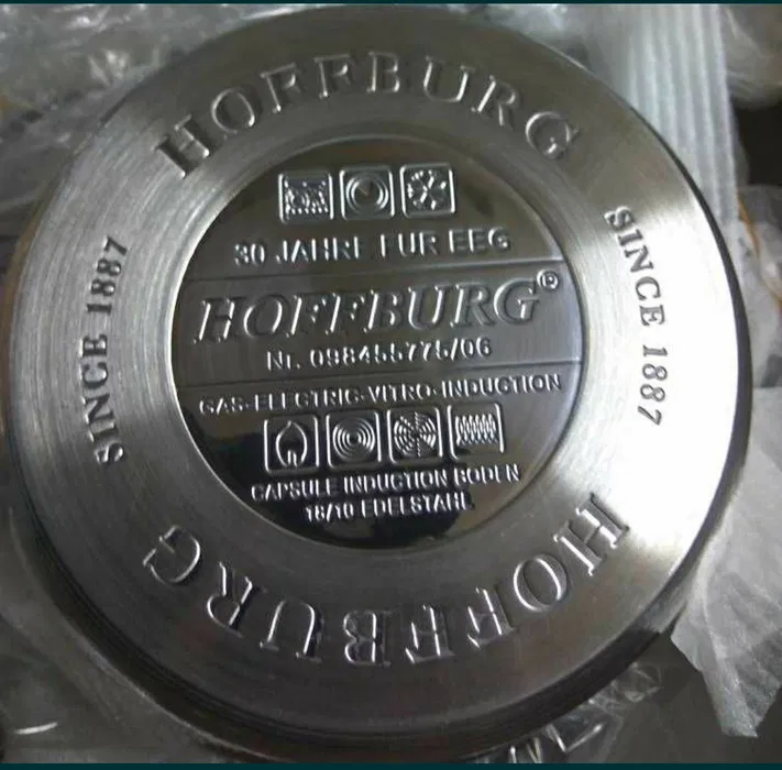 Komplet solidnych garnków ze stali, z grubym dnem 7 warstwowym, na wszystkie kuchenki, w tym indukcję. Pokrywy metalowe z gałkami, które wyposażone są w mechaniczny termometr. W zestawie : patelnia stalowa z pokrywą 24cm garnek duzy 24cm, 6L +pokrywa garnek średni 20cm, 3,5L+pokrywa garnek mały 16cm, 1,5L +pokrywa rondel 16cm, 1,5L +pokrywa nakładka na garnki do gotowania piętrowego na parze miska z pokrywą dwie podkładki żaroodporne pod garnki przyssawka