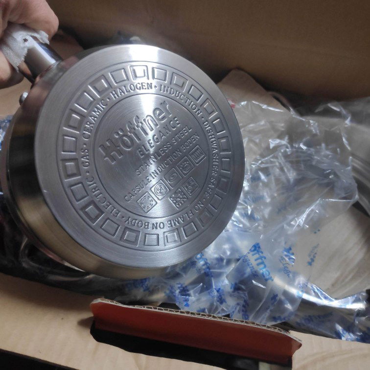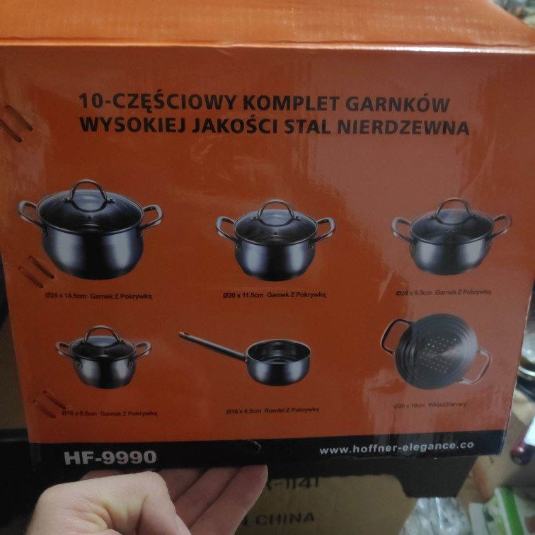 Zestaw garnków kuchennych Hoffner o grubszych ściankach. Kompletny zestaw zawierający garnki w różnych rozmiarach, doskonały do codziennego użytku w kuchni. Pojemności i rozmiary na zdjęciu w galerii. Na każdą kuchenkę. Takie grubsze garnki.