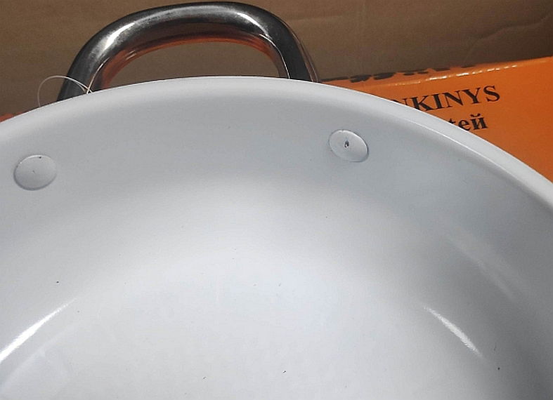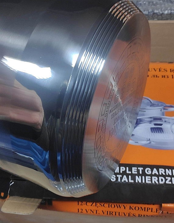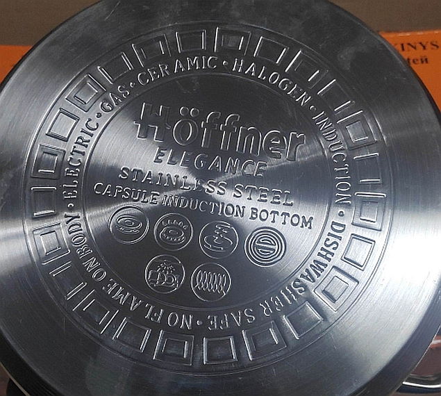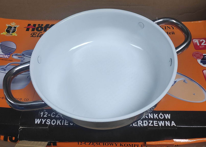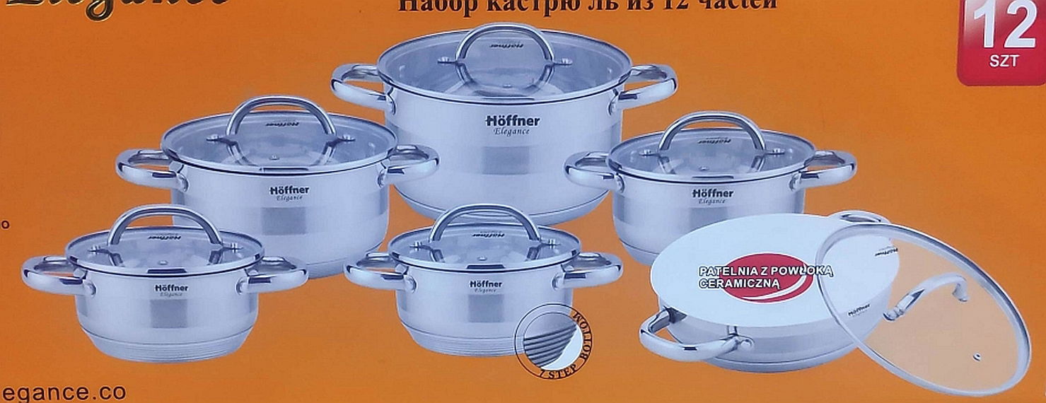Komplet garnków stalowych Hoffner z płaskimi pokrywkami. Wersja jak na zdjęciach. W zestawie patelnia ceramiczna (jak na trzecim zdjęciu przy jednym nicie mała skaza). W komplecie: garnek 24cm 5,5L garnek 20cm 3,2L garnek 18cm 2,5L garnek 16cm 1,5L garnek 16cm 1,5L patelnia ceramiczna z krótkim i chwytami 24cm ok 6 cm głębokość. pokrywki szklane.