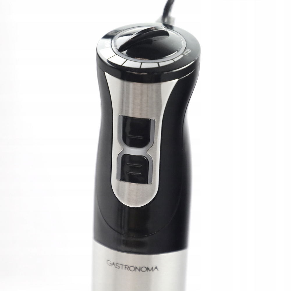 Blender ręczny Gastronoma, w kolorze czarnym z elementami ze stali nierdzewnej, ma wymiary 41,5 x 6,6 x 6,6 cm i waży 1,56 kg, co czyni go stylowym i praktycznym dodatkiem do każdej kuchni. Dzięki długości przewodu 1,45 m i zasilaniu 220V - 240V, blender jest łatwy w manewrowaniu i pasuje do różnych potrzeb kuchennych. W zestawie znajduje się także miska do siekania, miarka z pokrywką oraz instrukcja obsługi, co sprawia, że korzystanie z niego jest wygodne i bezproblemowe.