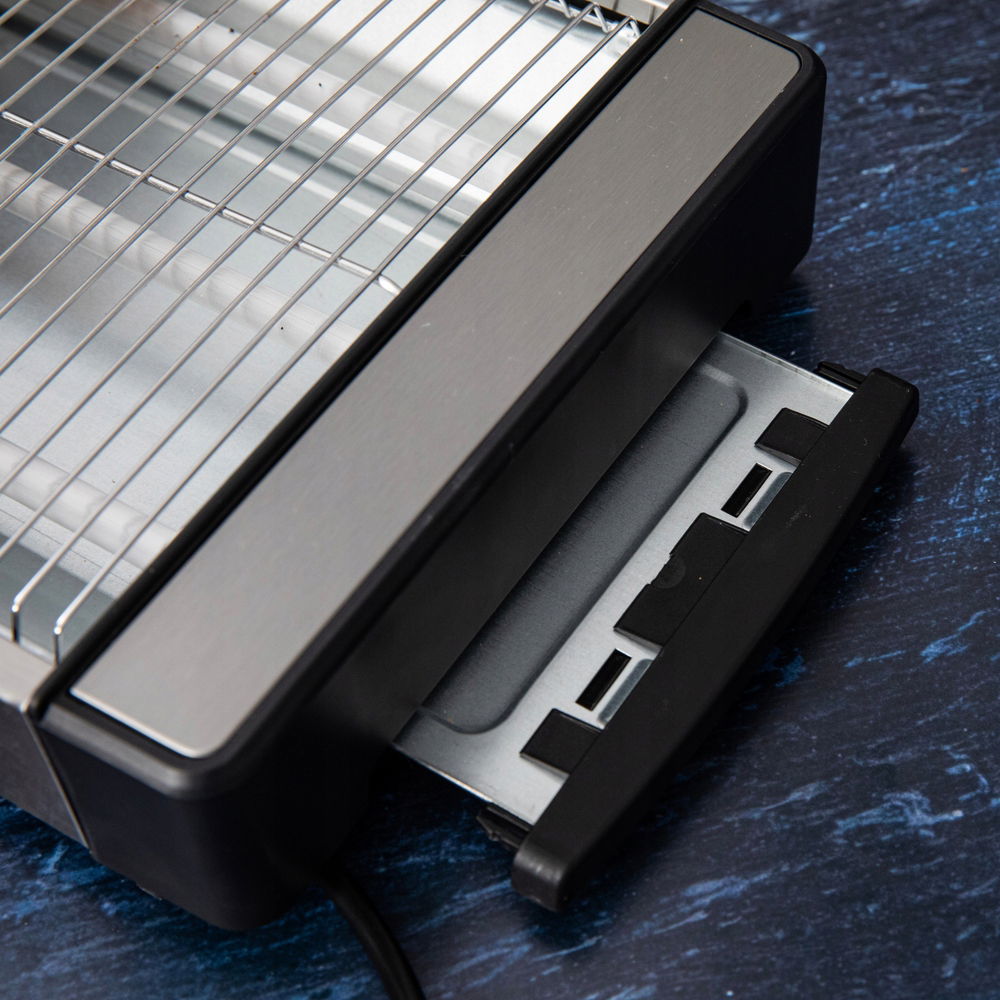 Model wyposażony jest w cyfrowy zegar oraz 6 poziomów opiekania, co pozwala dostosować stopień wypieczenia do własnych upodobań. Dzięki wyjmowanej szufladzie na okruszki czyszczenie urządzenia jest szybkie i bezproblemowe, a schowek na kabel zwiększa komfort przechowywania. Toster łączy funkcjonalność z nowoczesnym wyglądem, sprawiając, że pasuje do każdej kuchni.