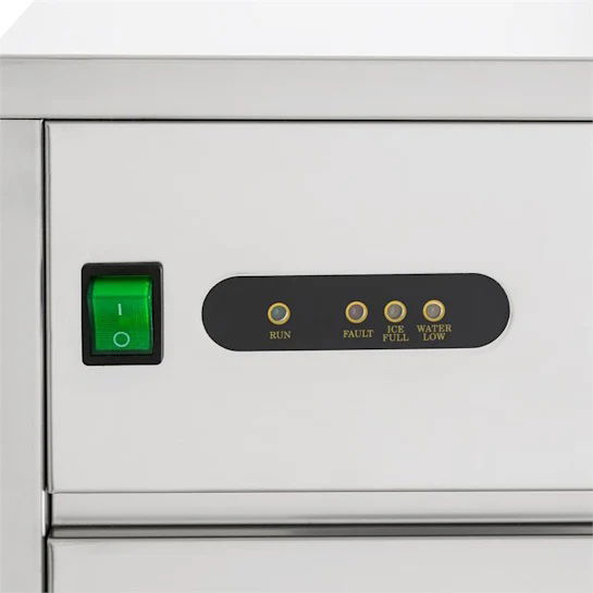 Umieszczone na przednim panelu diody LED sygnalizują o pracy urządzenia, zapełnieniu pojemnika a lód, braku wody lub błędzie urządzenia.