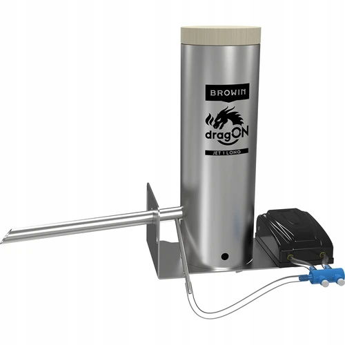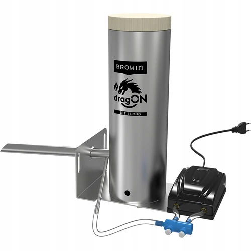 Uniwersalny generator dymu wykonany ze stali nierdzewnej, do każdej wędzarni - ten solidny i odporny na różne warunki atmosferyczne dymogenerator można zamontować do wędzarni stalowej, drewnianej czy murowanej. Długość dyszy w tym modelu umożliwia wykorzystanie dymogeneratora także do wędzarni o grubości ścianek powyżej 3cm (max. do 15 cm). Innowacyjna, wydłużona dysza generatora dymu - jej konstrukcja z odpowiednio ściętymi zakończeniami, specjalną rurką kątową oraz podłączana pompka zapewniają idealne, równomierne wdmuchiwanie dymu do wędzarni oraz wysoką wydajność przy niskim zużyciu zrębków. Dysza wprowadzana jest do wędzarni pod kątem zwiększającym przepływ dymu i pozwala zminimalizować gromadzenie się osadu zapychającego typowe rurki podczas wyżarzania zrębków. Prosty montaż i demontaż - zastosowane rozwiązania konstrukcyjne pozwalają na szybkie i łatwe połączenie generatora z wędzarnią oraz przygotowanie go do pracy (a także zdemontowanie). Jednocześnie zapewniona jest odpowiednia szczelność urządzenia podczas wytwarzania dymu wędzarniczego. Pojemny korpus (tuba) - pozwala na umieszczenie w generatorze ok. 450 g zrębków wędzarniczych (kaliber 8-12). Taka ilość zrębków pozwala na kilka godzin wędzenia, bez konieczności dosypywania zrębków. Łatwe czyszczenie - dymogenerator można z łatwością rozebrać i wyczyścić, bez konieczności odkręcania jego podstawy od wędzarni i bez używania jakichkolwiek narzędzi. Wydajna elektryczna pompka z regulacją przepływu powietrza, optymalizująca efektywność spalania zrębków - zapomnij o zawieszaniu się zrębków! Dzięki umieszczeniu pompki na dedykowanej podstawie montażowej, wibracje generowane przez pompkę są bezpośrednio przenoszone na komorę spalania, poprawiając osypywanie się zrębków w procesie ich wyżarzania.