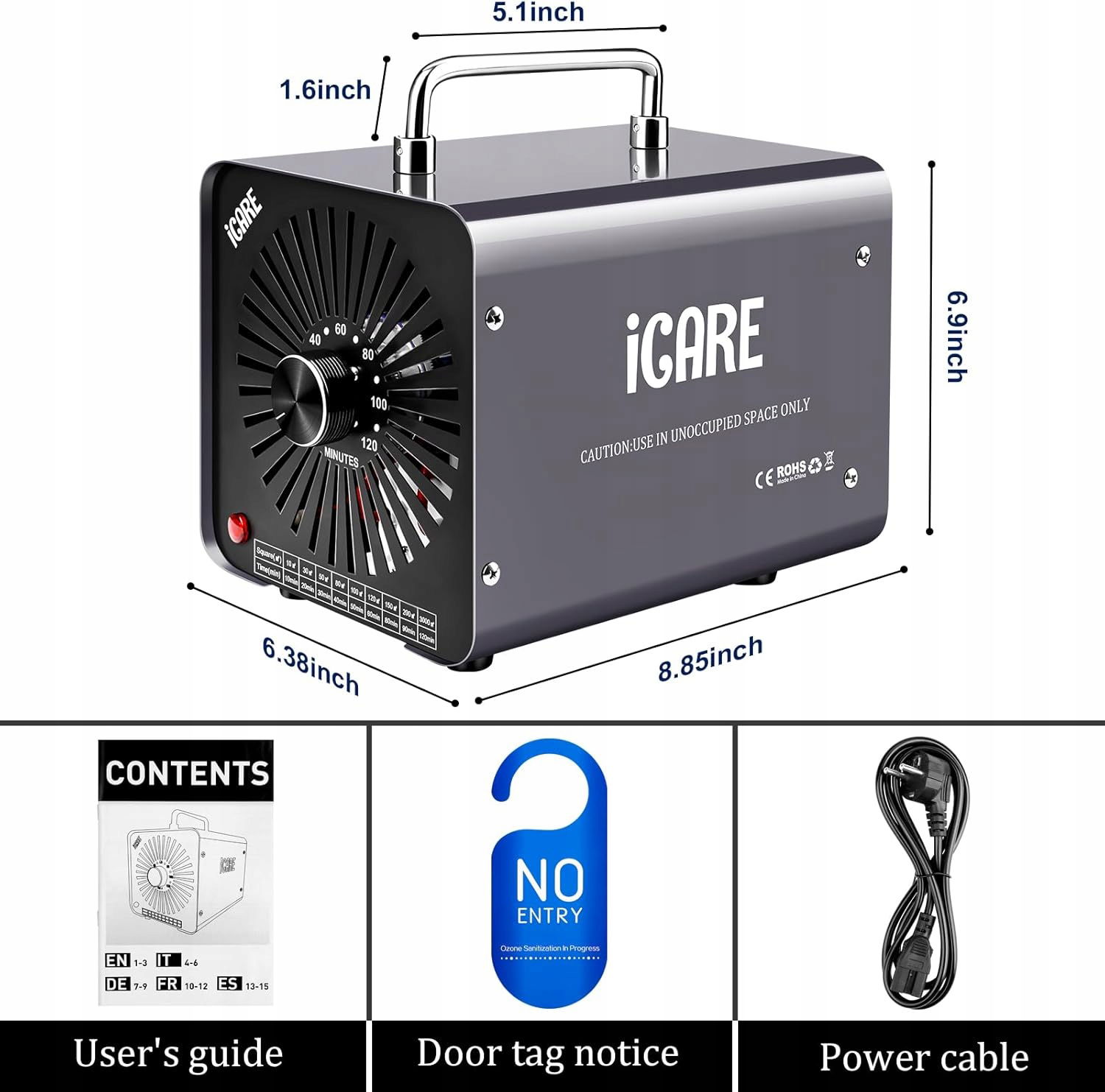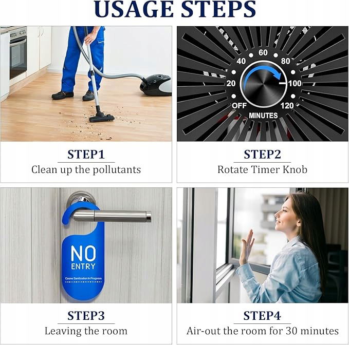 Przyjazny generator ozonu: Użycie ozonu do oczyszczania powietrza to najskuteczniejsza i najprostsza metoda. Wykorzystuje on jonizację wysokonapięciową do rozkładu i polimeryzacji części tlenu w powietrzu, co pozwala na szybkie wytworzenie ozonu. O3 wiąże się z mikroorganizmami i zaburza strukturę błony komórkowej poprzez utlenianie O2, zapewniając oczyszczanie. Nie tylko nie wymaga filtra, ale również oczyszcza powietrze, redukując ozon do tlenu. Oczyszczacz powietrza ozonowego z timerem 120-minutowym: Dzięki timerowi, który umożliwia regulację czasu pracy do 2 godzin, możesz ustawić czas w zależności od wielkości pomieszczenia i intensywności neutralizowanego zapachu. Pokrętło timera zostało ulepszone, dzięki czemu możesz je przekręcić bezpośrednio, aby zmienić czas, nawet jeśli ustawisz go bez resetowania, co jest wygodniejsze w użyciu niż generatory ozonu innych producentów.