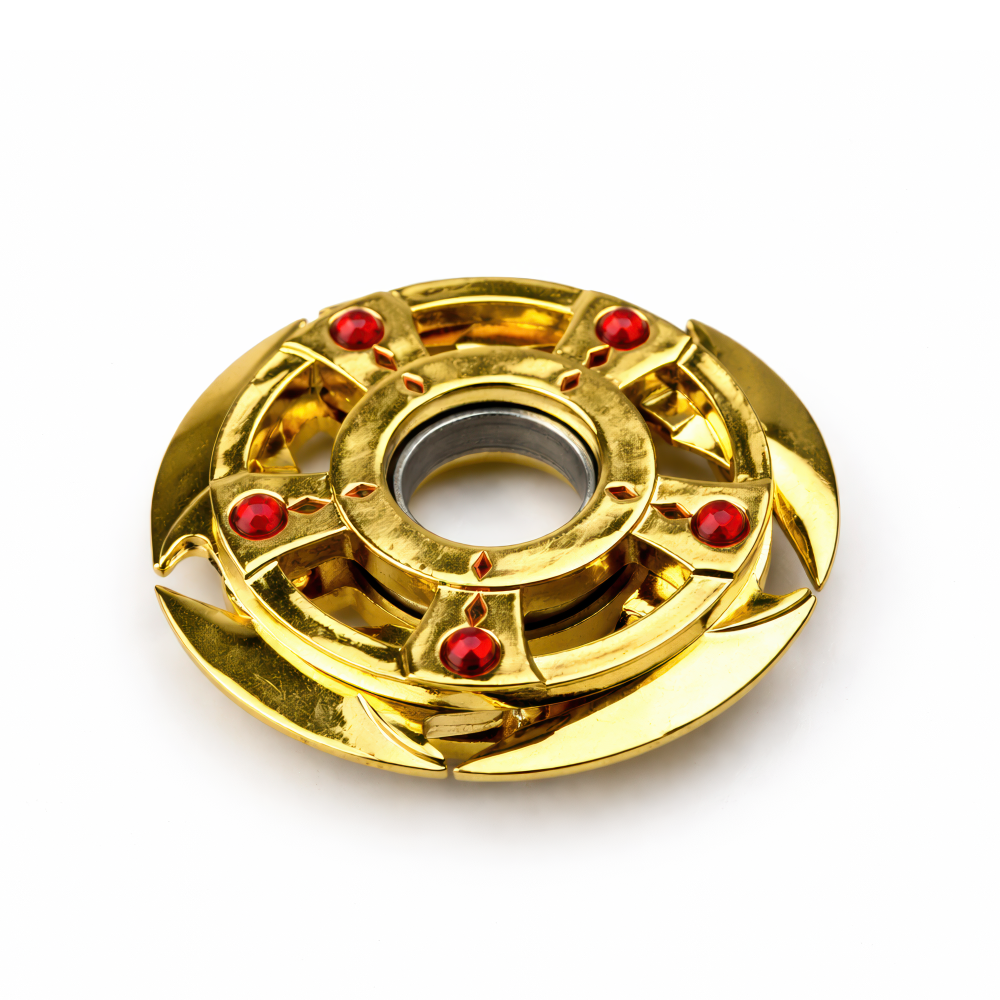 Błyszczące, lustrzane złote wykończenie łączy się z warstwową konstrukcją i wycięciami tworzącymi fajną grę światła, a gładkie łożysko w środku aż prosi, żeby zakręcić jeszcze raz. Pięć wygiętych, sierpowatych ostrzy układa się w klasyczną sylwetkę shuriken, a rubinowe detale robią robotę: okrągłe, połyskujące „nity” w ramie oraz ostre romby przy każdym ostrzu, jakby były małymi węzłami energii. Wyraźne fazowania i wypukłe linie podbijają futurystyczny klimat znany z gry i kojarzą się z efektownym, złotym „tierem” sprzętu bohaterów. Całość ma ten zdyscyplinowany, shimadowski vibe Genjiego — ostry, kontrolowany i elegancki. Postaw go na biurku, dorzuć jako prezent dla fana i niech wskoczy do Twojego loadoutu.