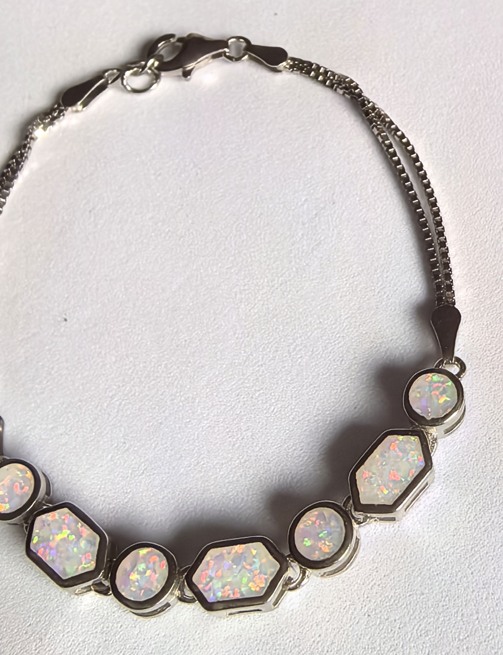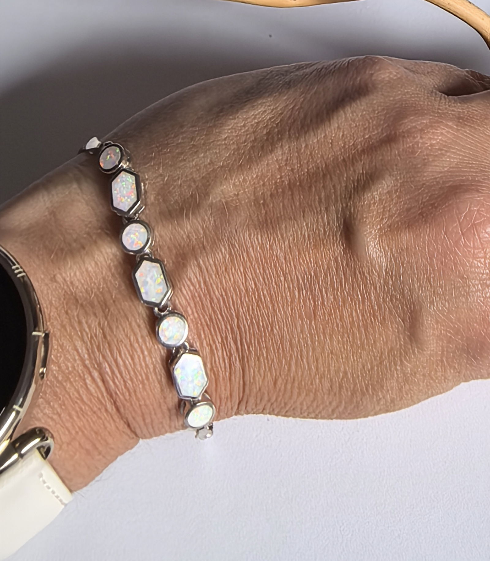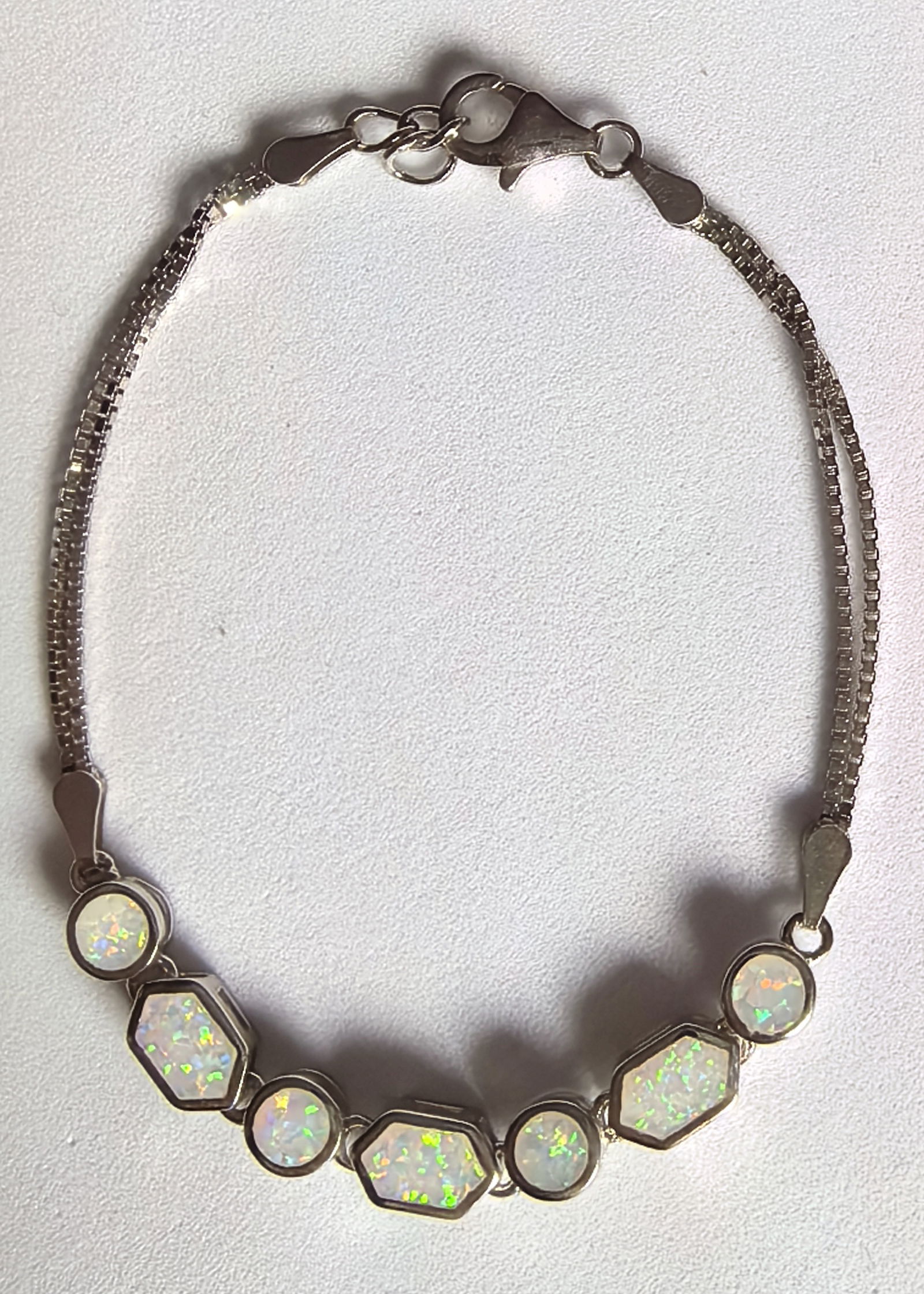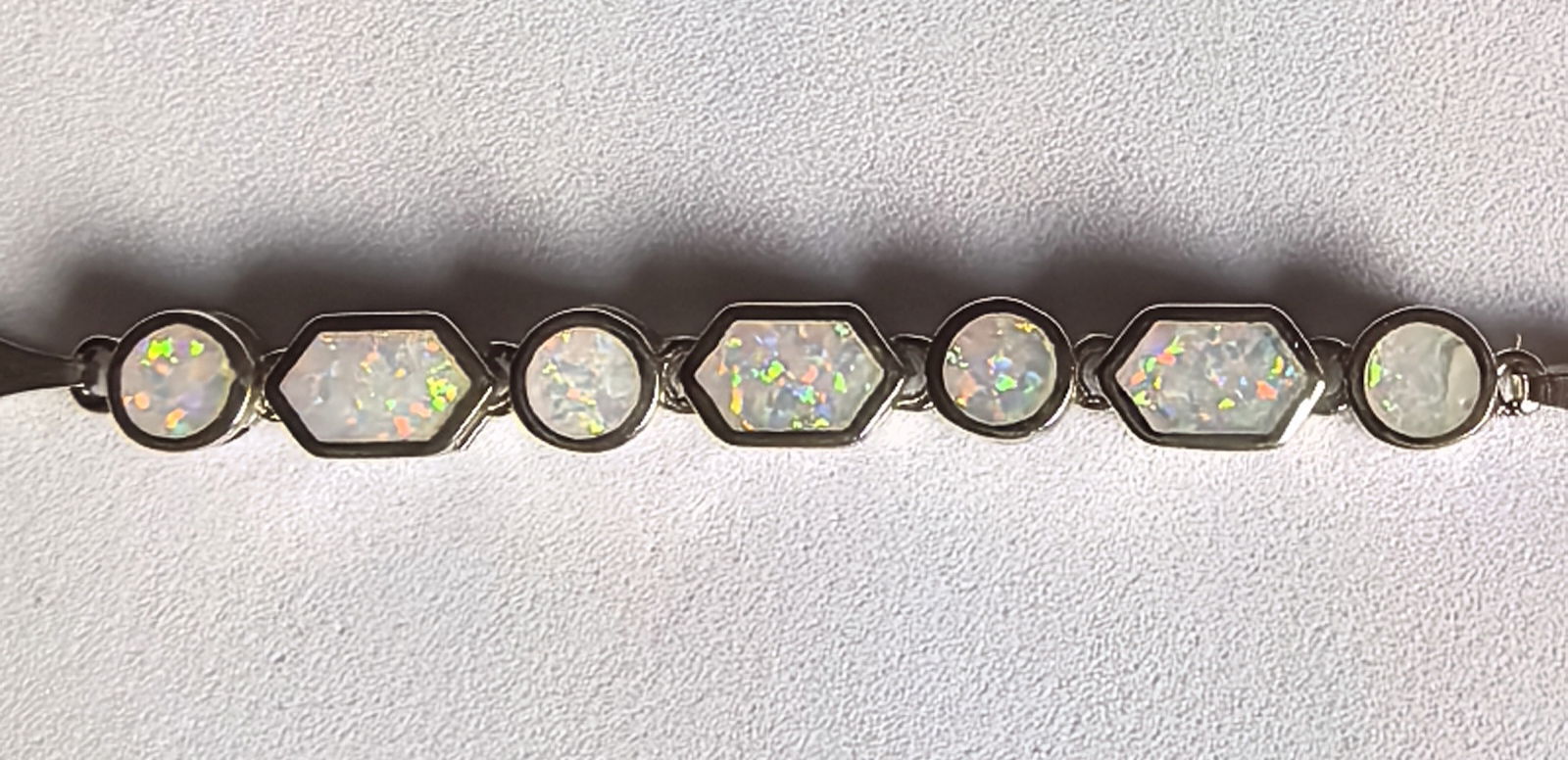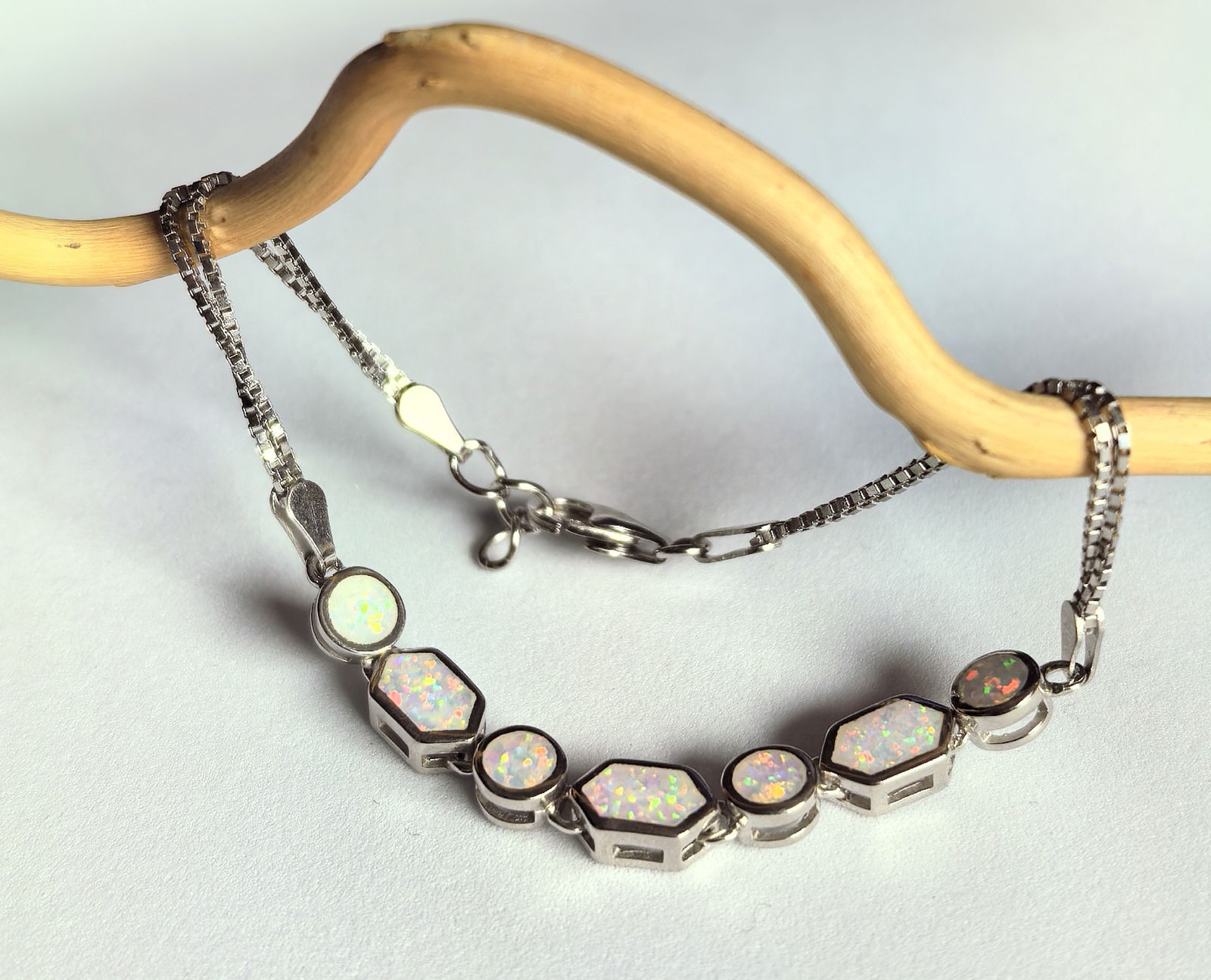 naprzemiennie ułożone okrągłe i prostokątne opale tworzą harmonijną kompozycję, w której każdy kamień mieni się odcieniami różu, błękitu, zieleni i złota