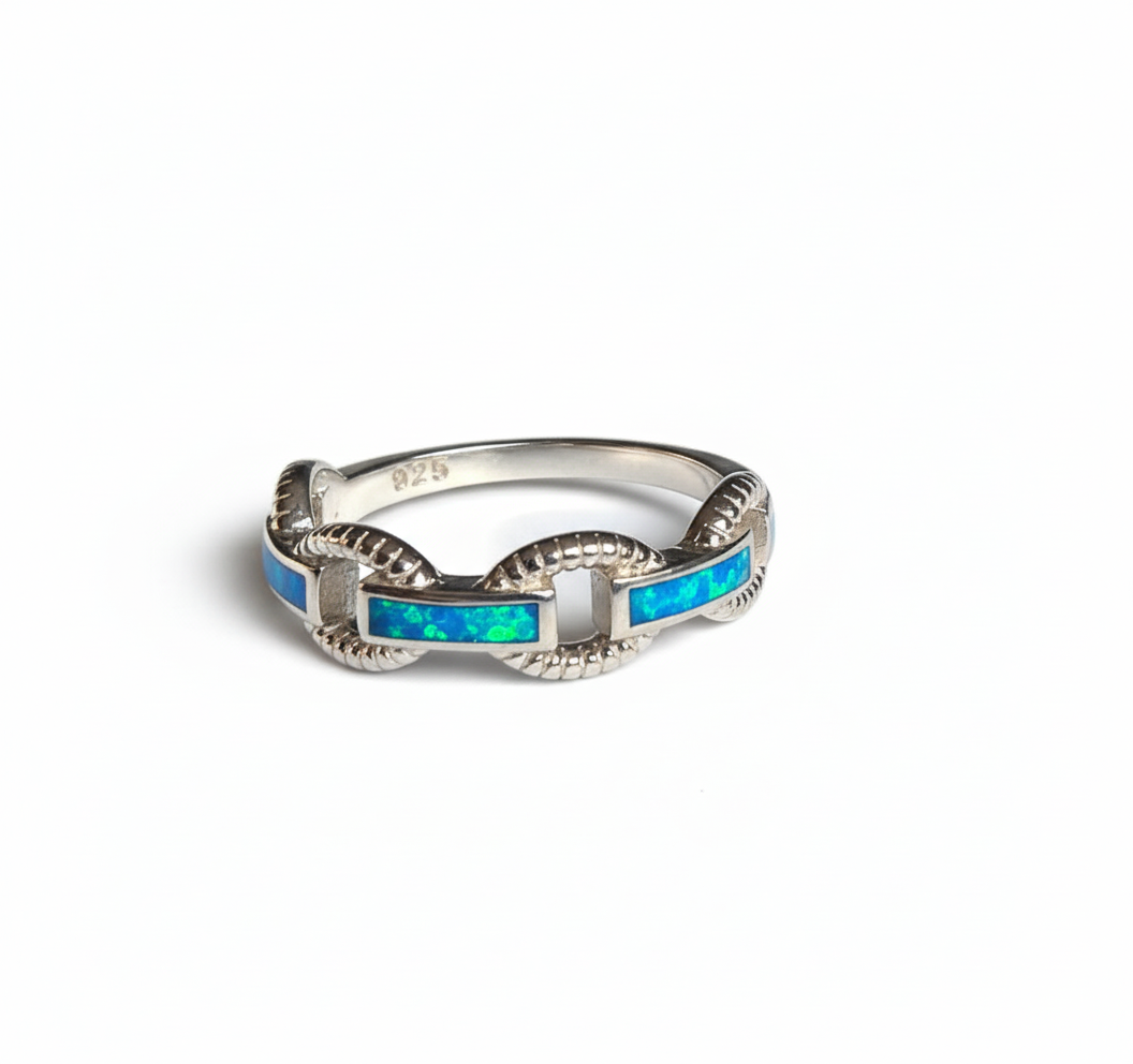• trzy prostokątne inkrustacje z niebieskiego opalu osadzone są w srebrnej oprawie o wzorze przypominającym łańcuch