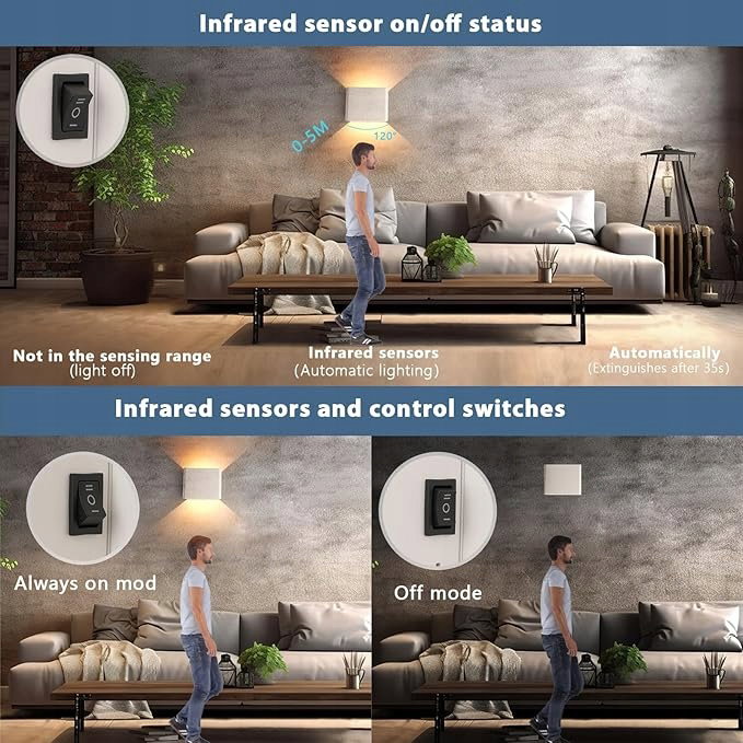 - 3 tryby oświetlenia: „I” Tryb automatyczny: Kinkiet jest wyposażony we wbudowany czujnik ruchu na podczerwień, który automatycznie włącza się po wykryciu ruchu w promieniu 5 metrów i pod kątem 120°, a następnie automatycznie wyłącza się po 30 sekundach bez ruchu. „II” Tryb włączenia: Zawsze włączony. „o” Tryb wyłączenia: Wyłącza światło.