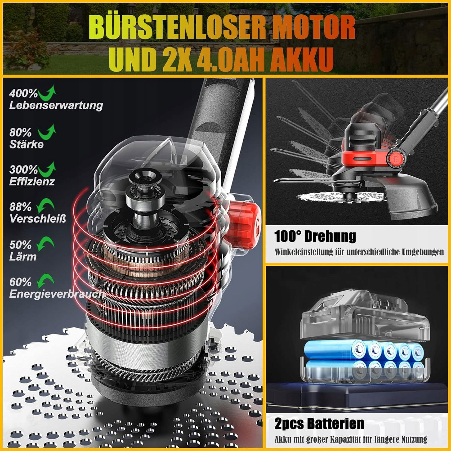 Dzięki akumulatorowi o długiej żywotności, pracujesz efektywnie nawet przez 1,5 godziny! Teleskopowy drążek umożliwia regulację wysokości, co gwarantuje komfort pracy. Bezszczotkowy silnik zapewnia wydajność i oszczędność energii.