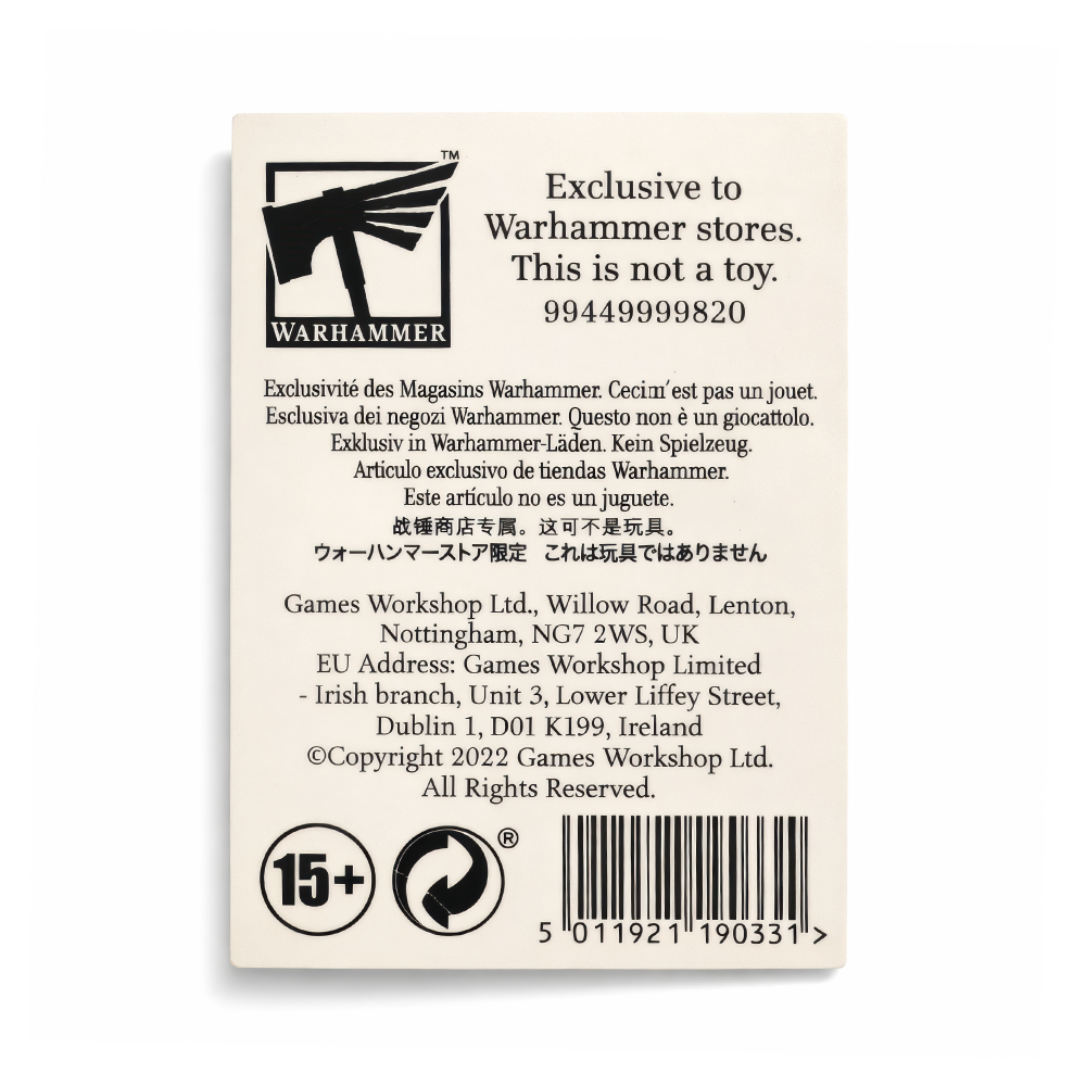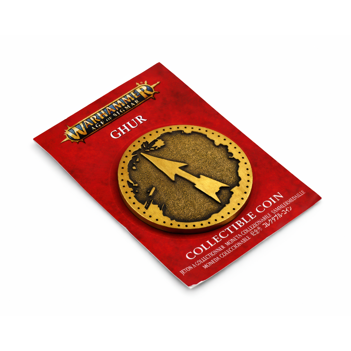 W Mortal Realms Ghur to Kraina Bestii — dzika, bezlitosna i wiecznie głodna — i ta moneta od razu wnosi ten pierwotny klimat na Twoją półkę. Przy 32 mm jest mała, ale konkretna: metal daje przyjemny ciężar, a antyczne, mosiężno-złote wykończenie z ciemniejszymi wgłębieniami wygląda jak żeton, który przeszedł przez kurz, kły i burze. To dyskretny, „namacalny” ukłon w stronę fanów: postaw ją na biurku, oprzyj obok walizki z armią albo noś w kieszeni, żeby złapać nastrój przed kolejną rozgrywką. Z bliska detale robią robotę: równa krawędź w kropki otacza mocno fakturowane tło, a przez środek biegnie wyraźny, podwójnie zakończony motyw strzały albo błyskawicy w jaśniejszym, gładkim reliefie. Dookoła widać poszarpane, przyciemnione kontury tworzące „mapowy” kształt, który świetnie pasuje do drapieżnych ostępów Ghur i jego wędrujących potworów — dokładnie w estetyce znaków-symboli znanych z Warhammer Age of Sigmar. Moneta przychodzi na głęboko czerwonej karcie „Collectible Coin” z napisem „GHUR” pod logo Warhammer Age of Sigmar; z tyłu jest informacja o ekskluzywności dla sklepów Warhammer i © 2022 Games Workshop Ltd. — gotowa, by dołączyć do Twojej kolekcji albo wskoczyć jako trafiony prezent dla innego hobbysty.