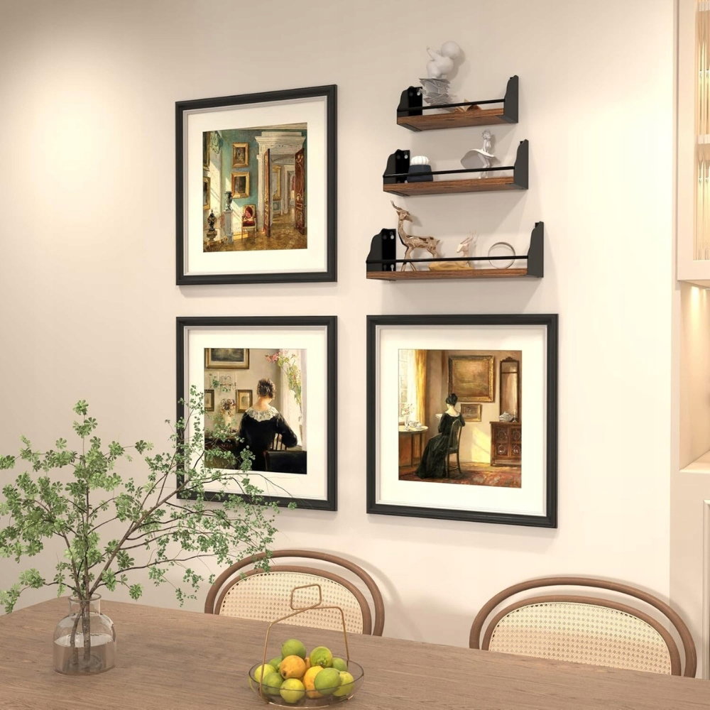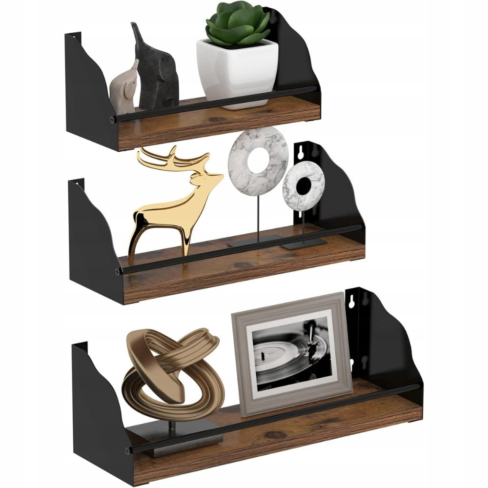 Nowoczesny i praktyczny zestaw 3 czarnych regałów ściennych marki Giftgarden. Połączenie metalu i drewna sprawia, że idealnie pasują zarówno do wnętrz nowoczesnych, jak i klasycznych. Zabezpieczenie w postaci ogrodzenia chroni przedmioty przed przypadkowym strąceniem – idealne do kuchni, salonu, sypialni czy biura.