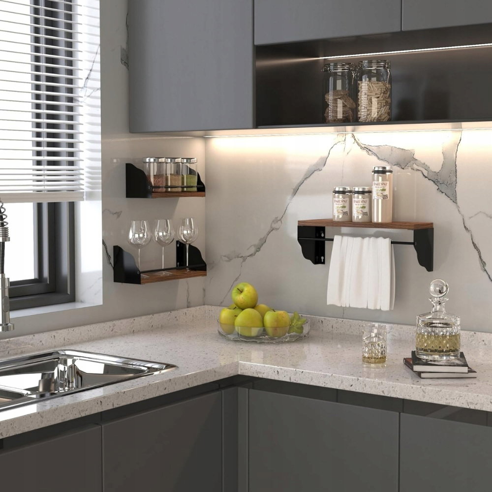 Wykonane z kompozytowego drewna i żelaznych uchwytów, półki są stabilne, odporne na odkształcenia i uszkodzenia mechaniczne. To połączenie stylu z funkcjonalnością, które sprawdzi się nawet w najbardziej wymagających przestrzeniach.