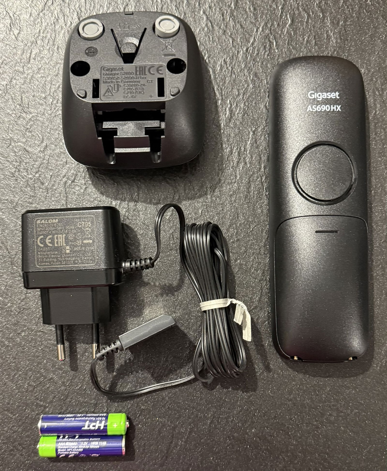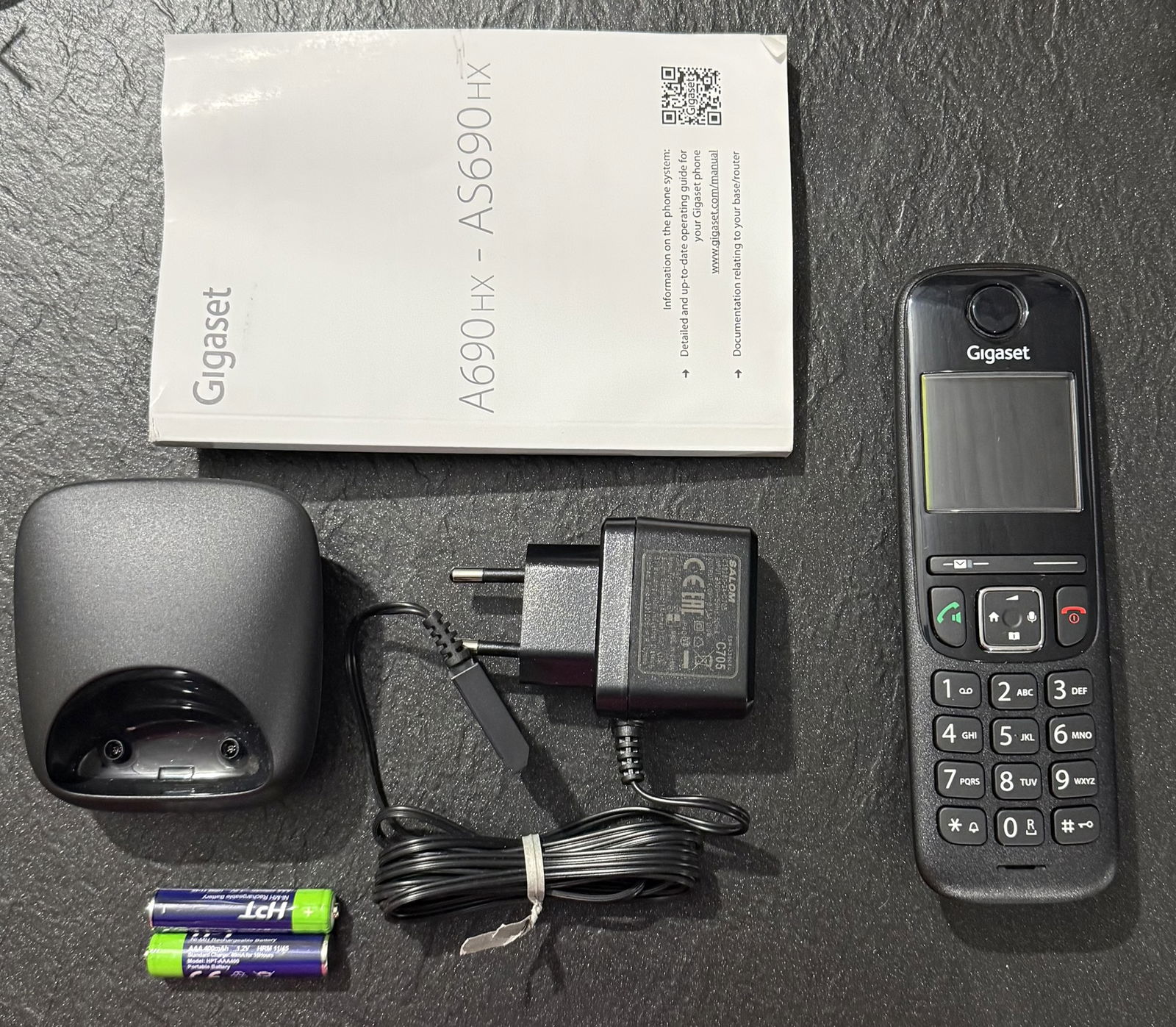 Zawartość opakowania: 1 x telefon Gigaset AS690HX, 1 x stacja ładująca, 1 x zasilacz, 2 x baterie AAA (NiMH), 1 x pokrywa baterii, 1 x instrukcja obsługi
