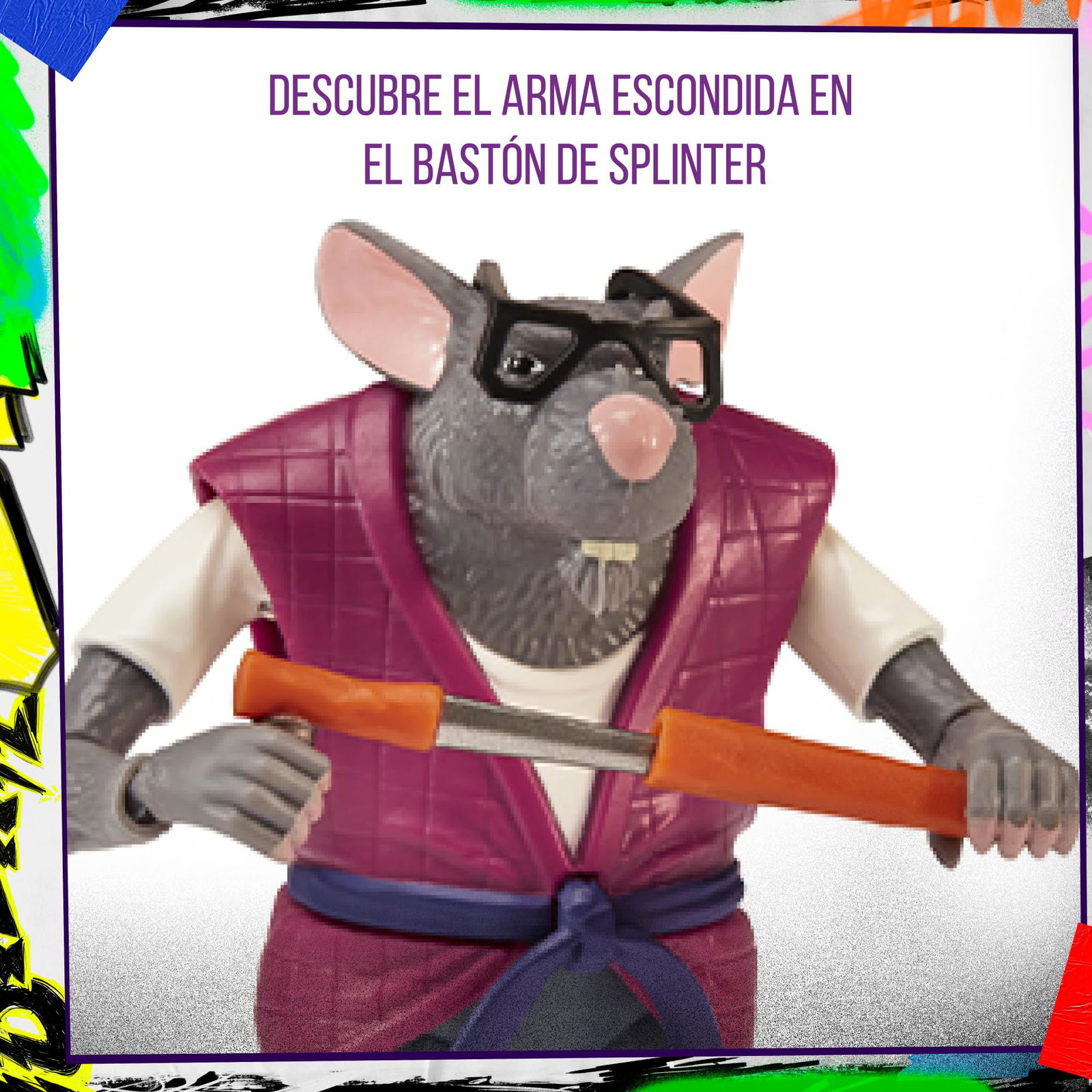 AKCESORIA: Mistrz Splinter jest gotowy do rozpoczęcia nowej walki ze swoją bronią, wierni towarzysze w walce ze złem Wewnątrz opakowania, ponadto mutant ma do dyspozycji również inną broń z różnymi akcesoriami