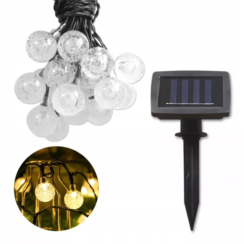 40 małych kulek o średnicy 2 cm zapewni nastrojowe oświetlenie. Dzięki zasilaniu solarnemu nie zapłacisz nic za prąd, a dzięki czujnikowi zmierzchu lampki się automatycznie włączały po zmierzchu. Długi przewód zasilający pozwala na umieszczenie lampek w sporej odległości od solara, co jest przydatne w wypadku montażu pod dachem np. na patio.