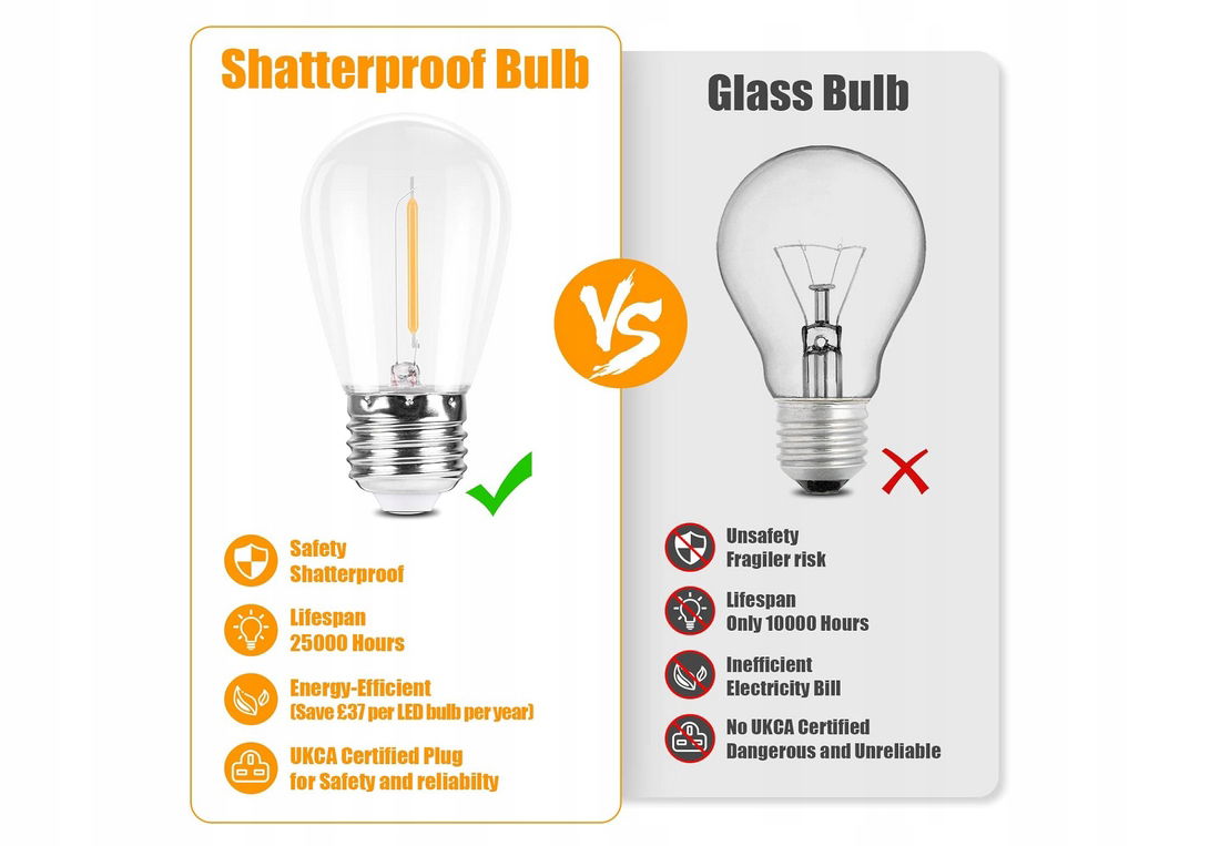 Super energooszczędne, nietłukące i odłączane: gniazda Seklin 106Ft 30 E26 z 30 szt. żarówek Edisona LED S14. Żarówka Wykonana z bezpiecznego tworzywa sztucznego i wytrzymałej gumy, którą trudno złamać nawet przypadkowo upuszczoną, a żarówki LED Seklin oszczędzają ponad 90% energii w porównaniu z żarówkami tradycyjnymi. Długa żywotność wynosząca 30 000 godzin może zmniejszyć koszty konserwacji związane z częstą wymianą żarówek.