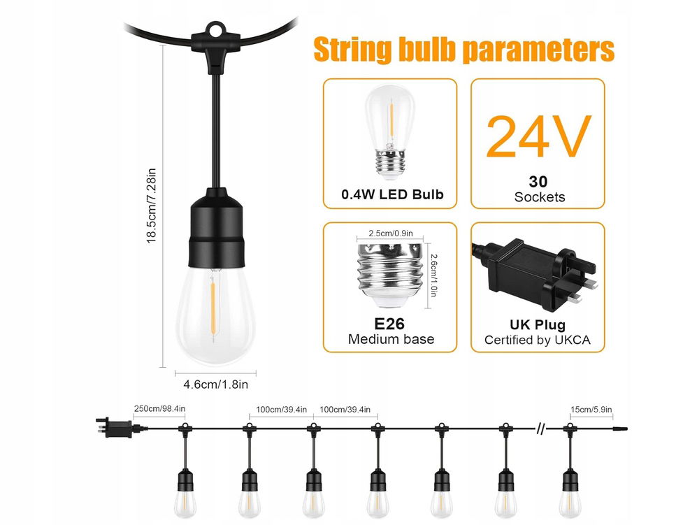 Łatwy w montażu. Każde gniazdo ma u góry otwór na hak, dzięki któremu można szybko zawiesić girlandy świetlne i zaoszczędzić czas. Z łatwością można je zawiesić idealnie w dowolnym miejscu. Idealny do ogrodu na świeżym powietrzu, basenu, altanki, werandy, tarasu, pergoli, wesela, baru, balkonu lub dowolnej imprezy i wydarzenia na świeżym powietrzu.