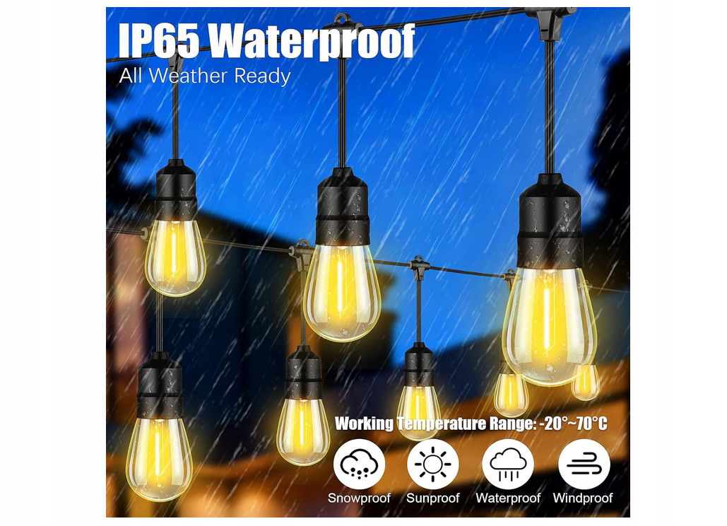 Wodoodporne zewnętrzne lampy ogrodowe Seklin S14 String Lights są wykonane ze specjalnych wodoodpornych gniazd, które tworzą głębokie uszczelnienie wokół żarówki. Wodoodporny drut miedziany IP65, nie przegrzewa się, ma wysoką wydajność i oszczędność energii. Owinięty przezroczystym PVC, który jest elastyczny i chroni drut miedziany przed złamaniem. Wytrzymują zużycie i wszelkiego rodzaju warunki pogodowe przez cały rok. Świetne do ogrodu na świeżym powietrzu, basenu, altanki, werandy, tarasu, wesela, baru, balkonu lub dowolnej imprezy na świeżym powietrzu