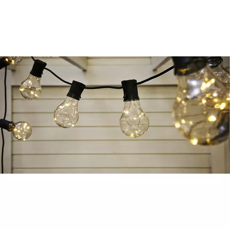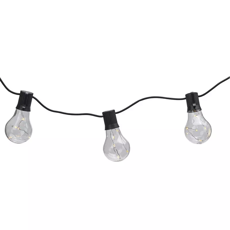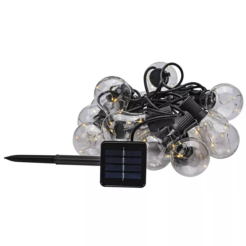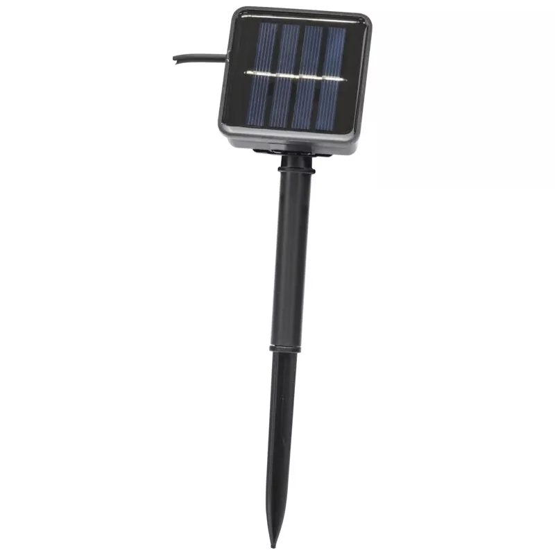 Girlanda solarna ogrodowa Led. Łańcuch świetlny ma łącznie 15 wytrzymałych lampek z tworzywa, które emitują ciepło-białe światło. Lampki są umieszczone w odstępach co 20 cm. Całkowita długość łańcucha wynosi 4,8 metra, z czego 2 metry stanowi sam przewód zasilający. Łańcuch jest wykonany z tworzywa sztucznego i zasilany akumulatorkiem AA (w zestawie).