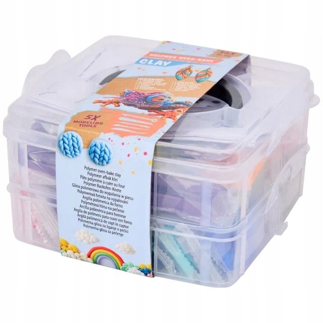 Dzięki wesołej, kolorowej glinie polimerowej i dołączonym akcesoriom możesz stworzyć własną biżuterię i kreatywne figurki. Wszystko jest poręcznie zebrane w przezroczystym pojemniku, dzięki czemu możesz od razu rozpocząć pracę!