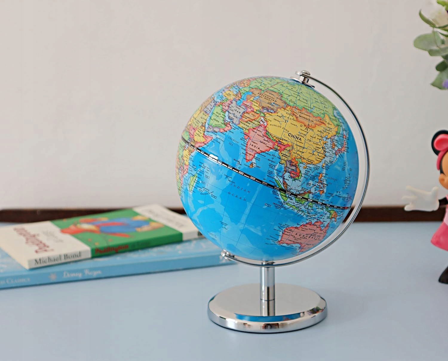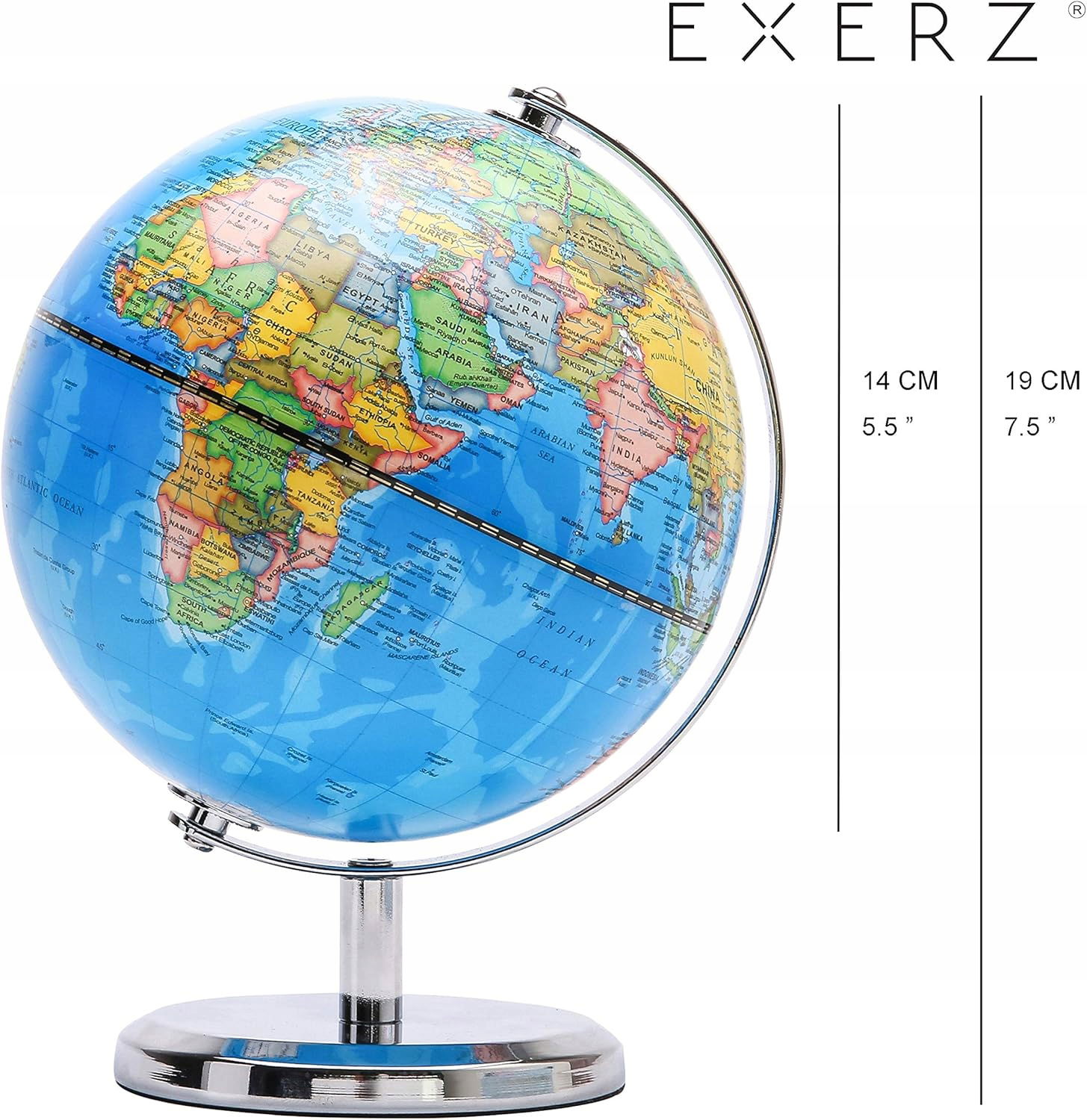 Exerz 14 cm globus dla ucznia, edukacja i zabawa, obrotowy globus, średnica: 14 cm, łatwy odczyt stref geograficznych; obraca się na stabilnym stojaku.