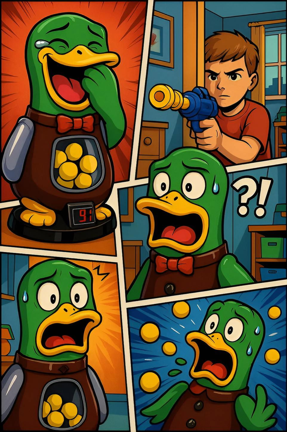 ✔️ Zabawa polega na strzelaniu w kaczkę - kaczka zlicza każde celne trafienie, a piłeczka wpada do pojemnika wewnątrz zabawki. ✔️