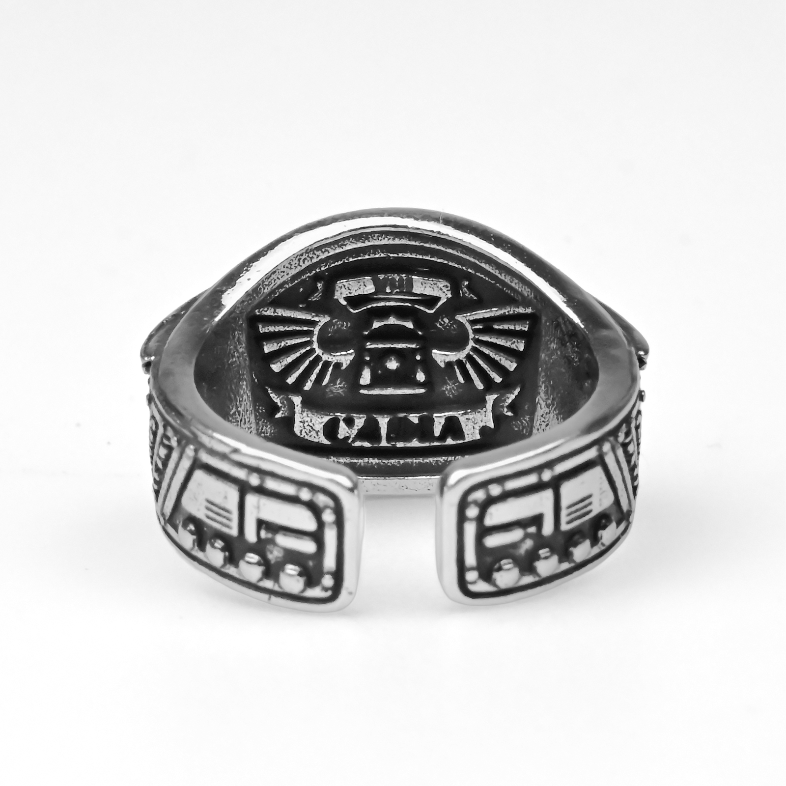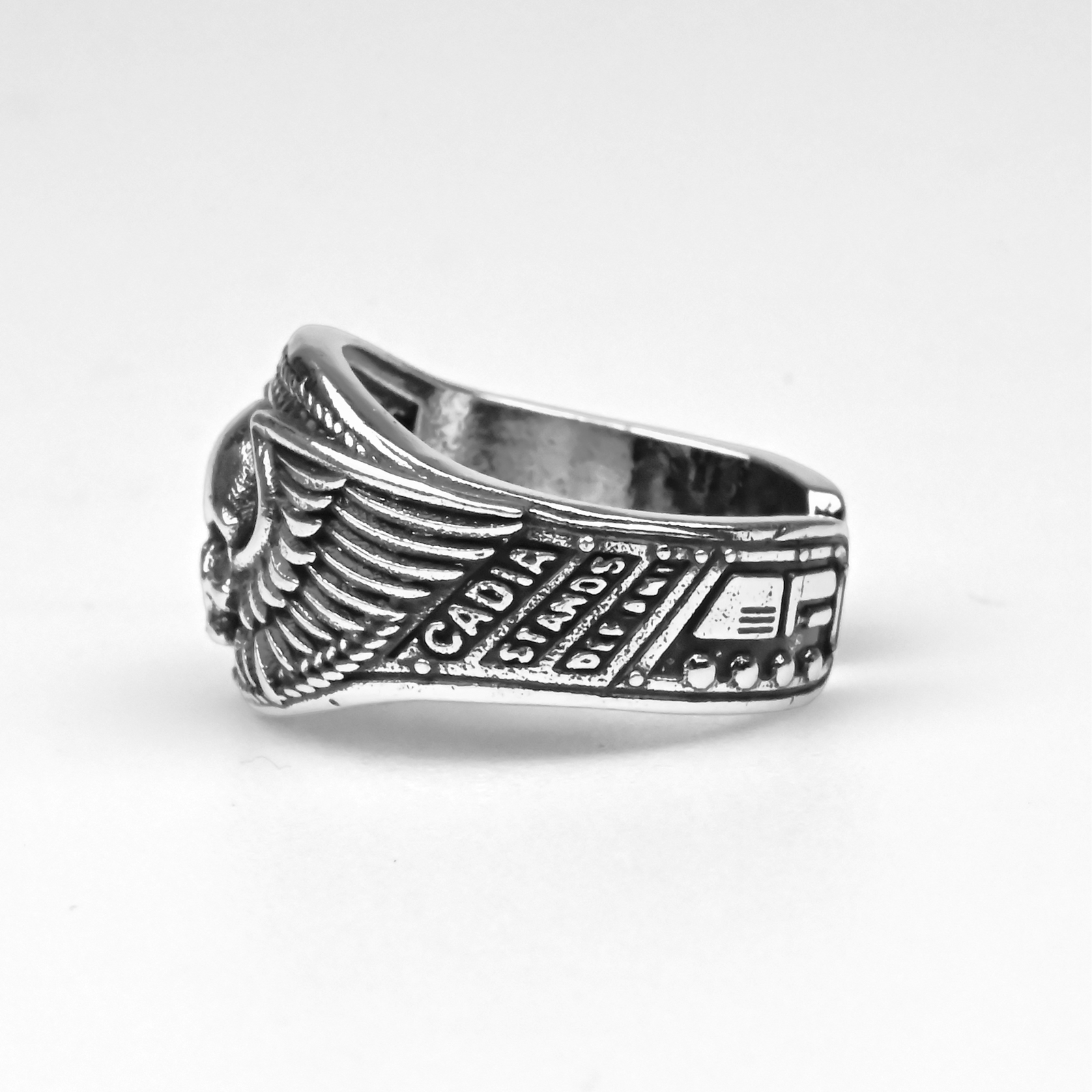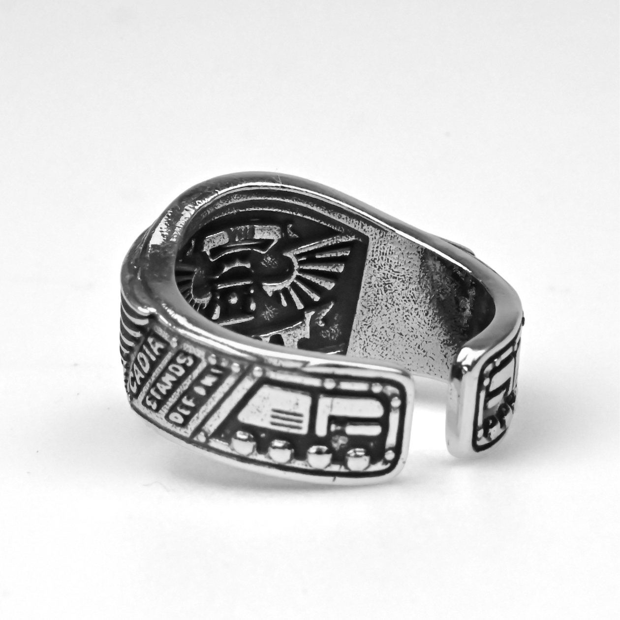 W mroku Warhammer 40k przysięga Cadii żyje dalej nawet po upadku planety — a pierścień Gloria Cadia daje Ci tę stalową determinację dosłownie na dłoni. Jeśli jesteś kolekcjonerem, grasz w bitewniaki albo robisz cosplay i na hasło „Cadia stands” masz ciarki, ten regulowany Metalowy Pierścionek będzie idealnym, noszonym na co dzień ukłonem w stronę najbardziej legendarnego świata-twierdzy Imperium. Front to mocny akcent: lśniąca, „chromowa” czaszka w głębokim, przyciemnionym zagłębieniu, ujęta szerokimi skrzydłami z ostro rzeźbionymi piórami i plecionym, laurowym rantem u góry. Na bokach masz wypukłe napisy „CADIA”, „STANDS”, „DEFENDS”, otoczone nitami i kanciastymi panelami jak z imperialnego ekwipunku — klimat jak z klasycznej heraldyki z kodeksów. W środku widać wklęsły emblemat nad słowem „CADIA”, jak ukryta pieczęć służby. Otwarta obrączka pozwala szybko dopasować rozmiar, a solidny metal daje przyjemny ciężar i połysk. Noś go do gry, do zdjęć z armią albo jako surowy detal do codziennej stylówki — i niech pilnuje Twojego EDC, półki z kolekcją albo kolejnej kampanii.