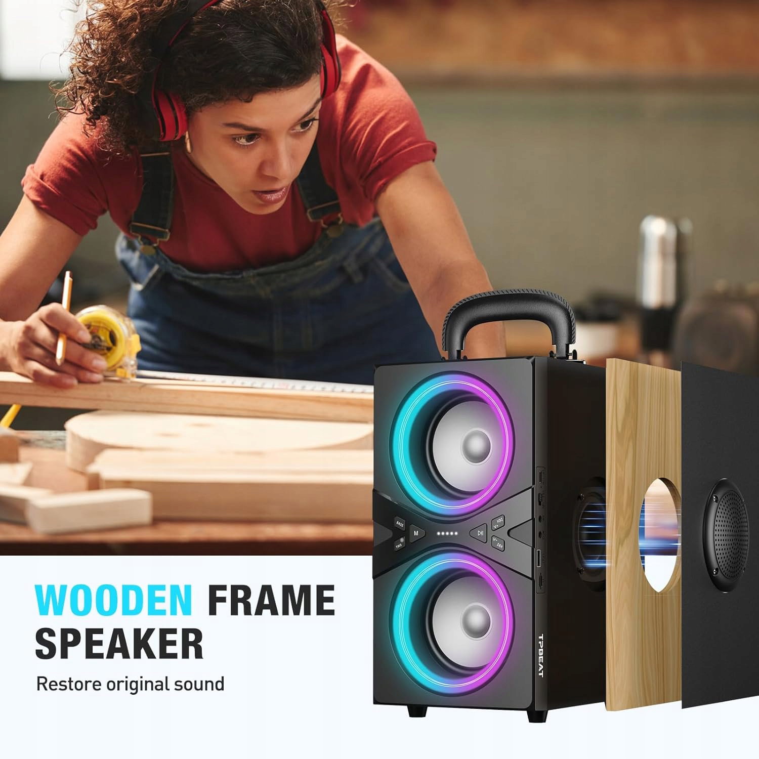 - Drewniana obudowa – Głośnik TPBEAT posiada obudowę wykonaną z naturalnego drewna, co minimalizuje rezonans i zniekształcenia dźwięku. Drewno zapewnia wyjątkową jakość akustyczną, dając głęboki, naturalny bas oraz klarowność w wyższych tonach.