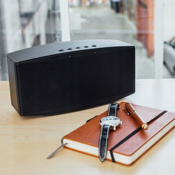 Powierzchnia ze szczotkowanego aluminium zapewnia głośnikowi o mocy 2 x 15 W RMS zrównoważony i wysokiej jakości dźwięk.